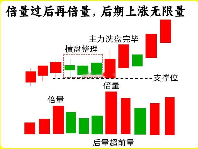 二、倍量过后再倍量股价处于上涨趋势里,股价经过短时间的上涨以后,出现倍量,形成前期的高点,随后股价开始横盘震荡,这就是上涨中继,成交量出现缩量,形成地量,在整个洗盘过程里,股价都没有跌破倍量对应的阳线最低价,随后股价再次出现倍量阳,出现连续堆量,说明主力洗盘结束,一般这个时候后面的倍量会比前面的倍量要大,后量超前量