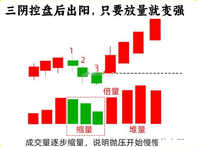 一、三阴控盘后出阳在上涨趋势里或是股价低位横盘阶段,股价线先是小幅度上涨以后,随后出现连续的三天阴线,同时成交量出现缩量,阴线的实体开始逐步缩小,同时都没有跌破重要支撑位,比如重要均线,高点等等,这是主力控盘表现,也是主力洗盘的形态,随后股价再次出现倍量阳线,出现阳线反包,说明主力洗盘完毕,多方力量开始强势