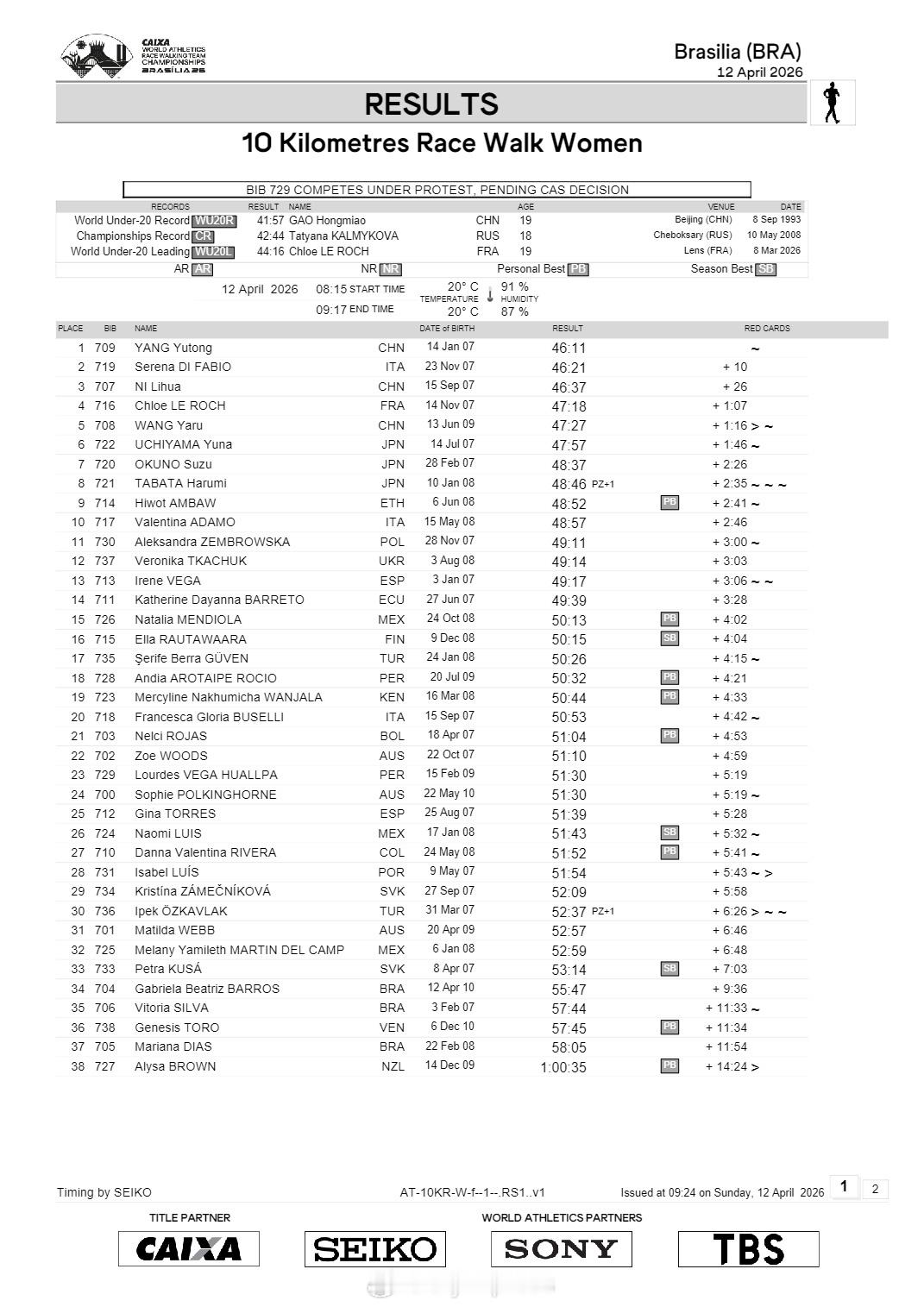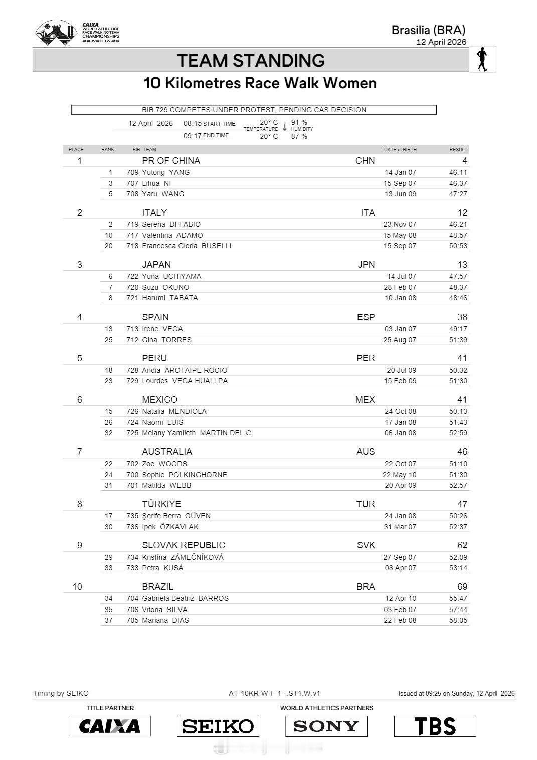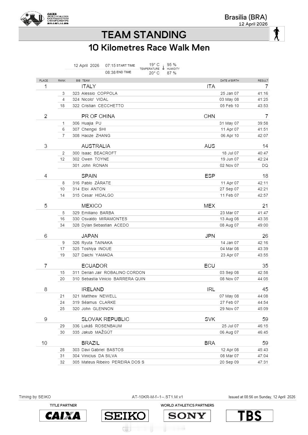 【竞走团体世锦赛10公里中国夺3金1银1铜】国际体坛战报速递 4月12日巴西利亚
