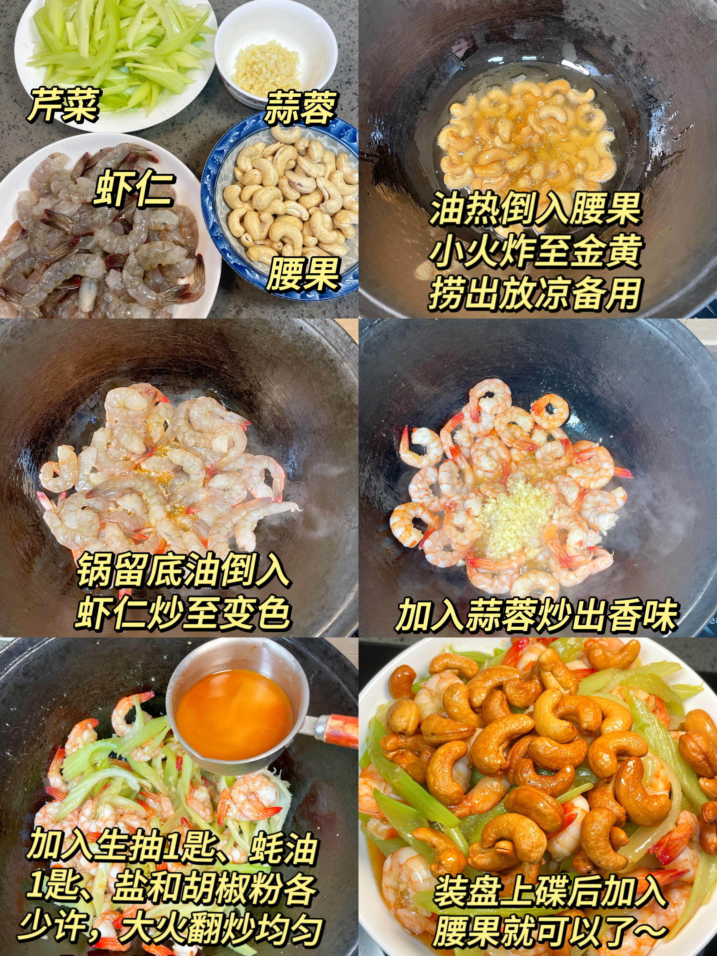 小贴士:腰果小火慢炸,避免炸糊发苦;虾仁炒至变色就好,久炒会变老发柴;芹菜翻炒至断生即可,保留脆爽口感,营养也不流失~