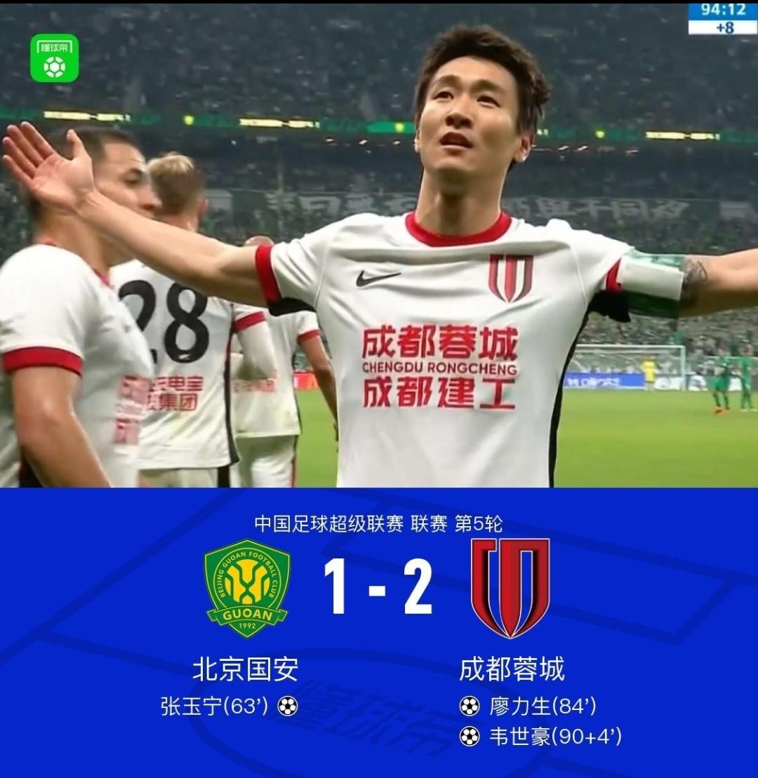 从0-1到2-1,成都蓉城在客场逆转北京国安,而且更为戏剧性的是,在伤停补时最后阶段由韦世豪射门进球完成的绝杀。