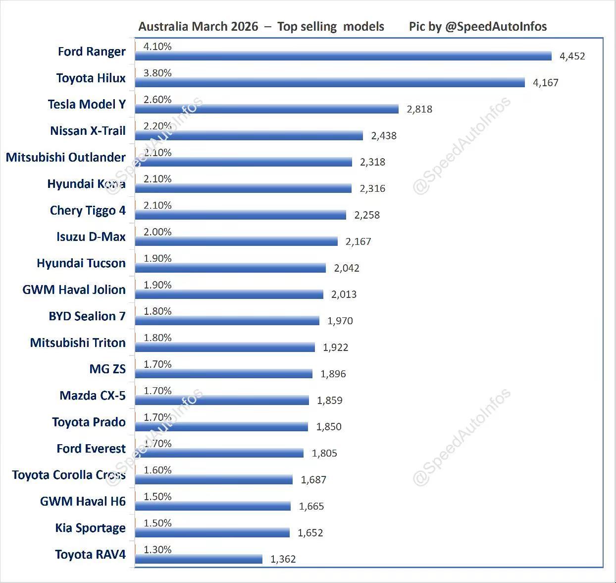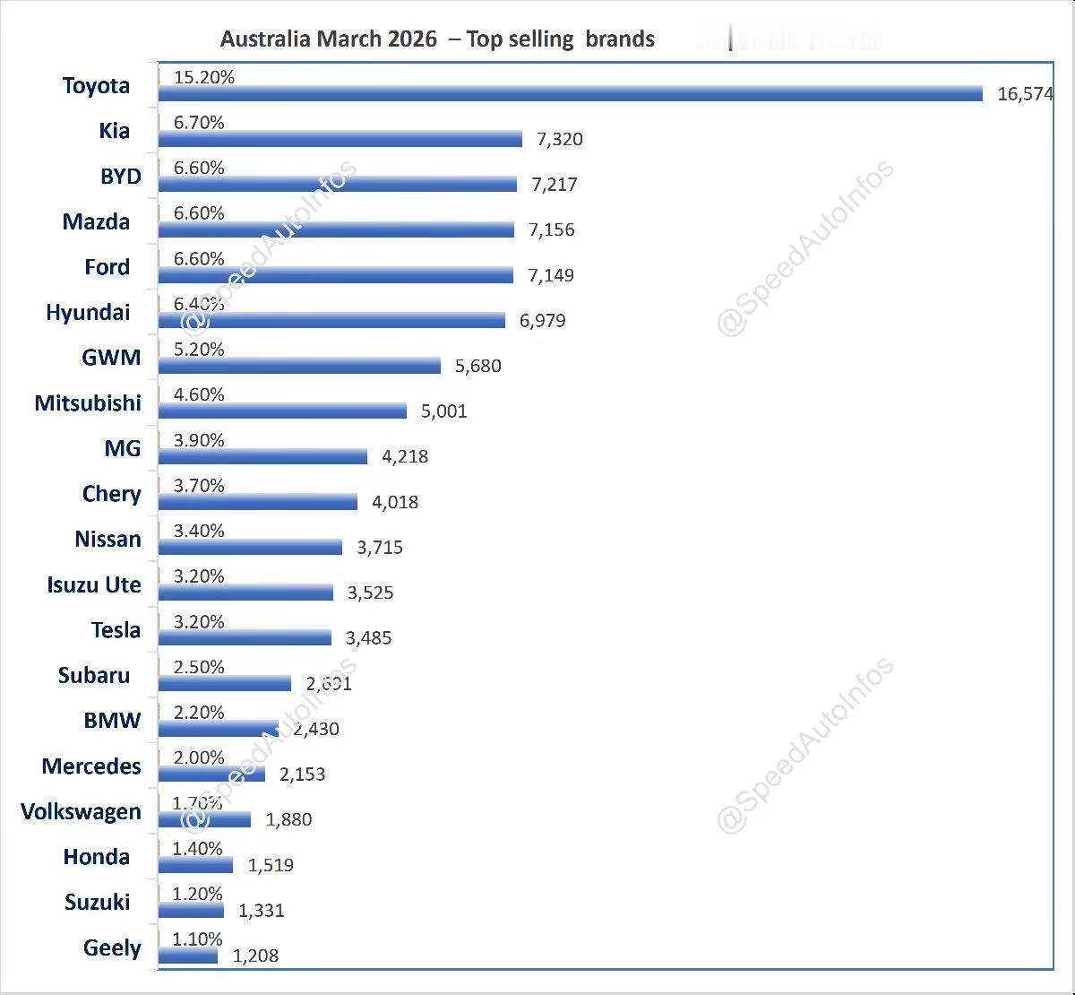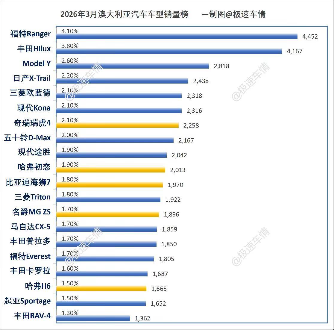 澳大利亚3月汽车销量排行榜!澳大利亚3月,比亚迪大涨50%,创历史拿第3;长城、