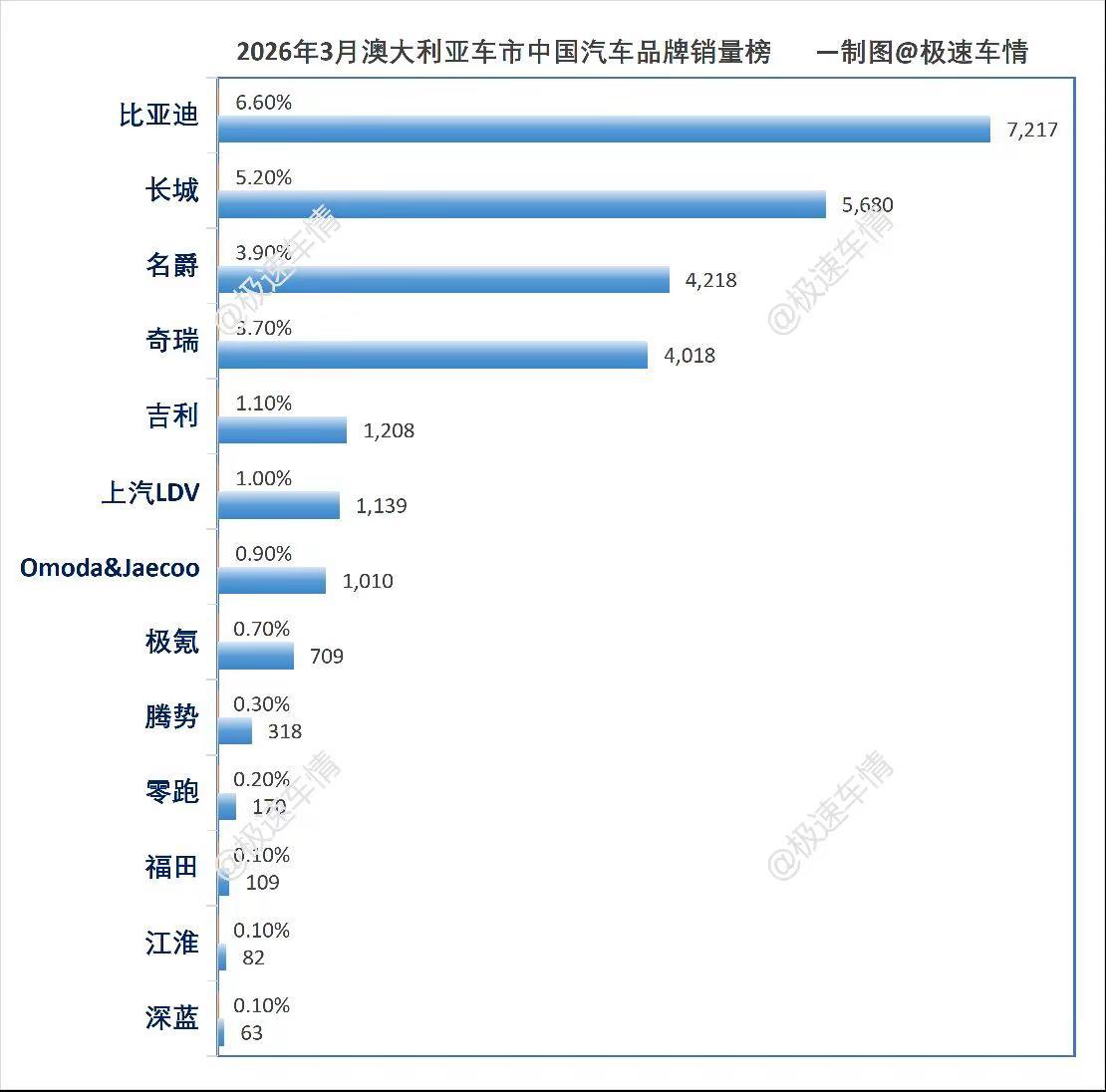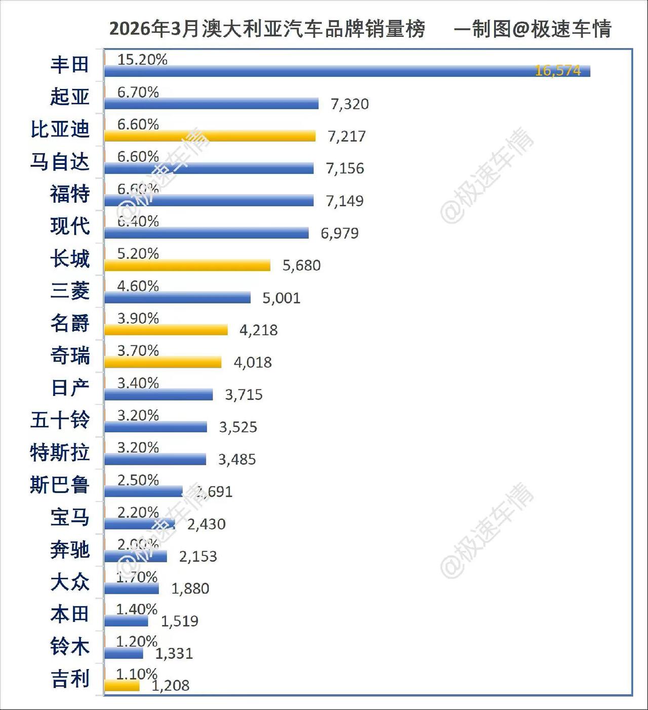 澳大利亚3月汽车销量排行榜!澳大利亚3月,比亚迪大涨50%,创历史拿第3;长城、名爵、奇瑞进Top10;吉利暴涨542.6%、极氪暴涨533%!极速车情 澳大利亚 比亚迪 长城汽车