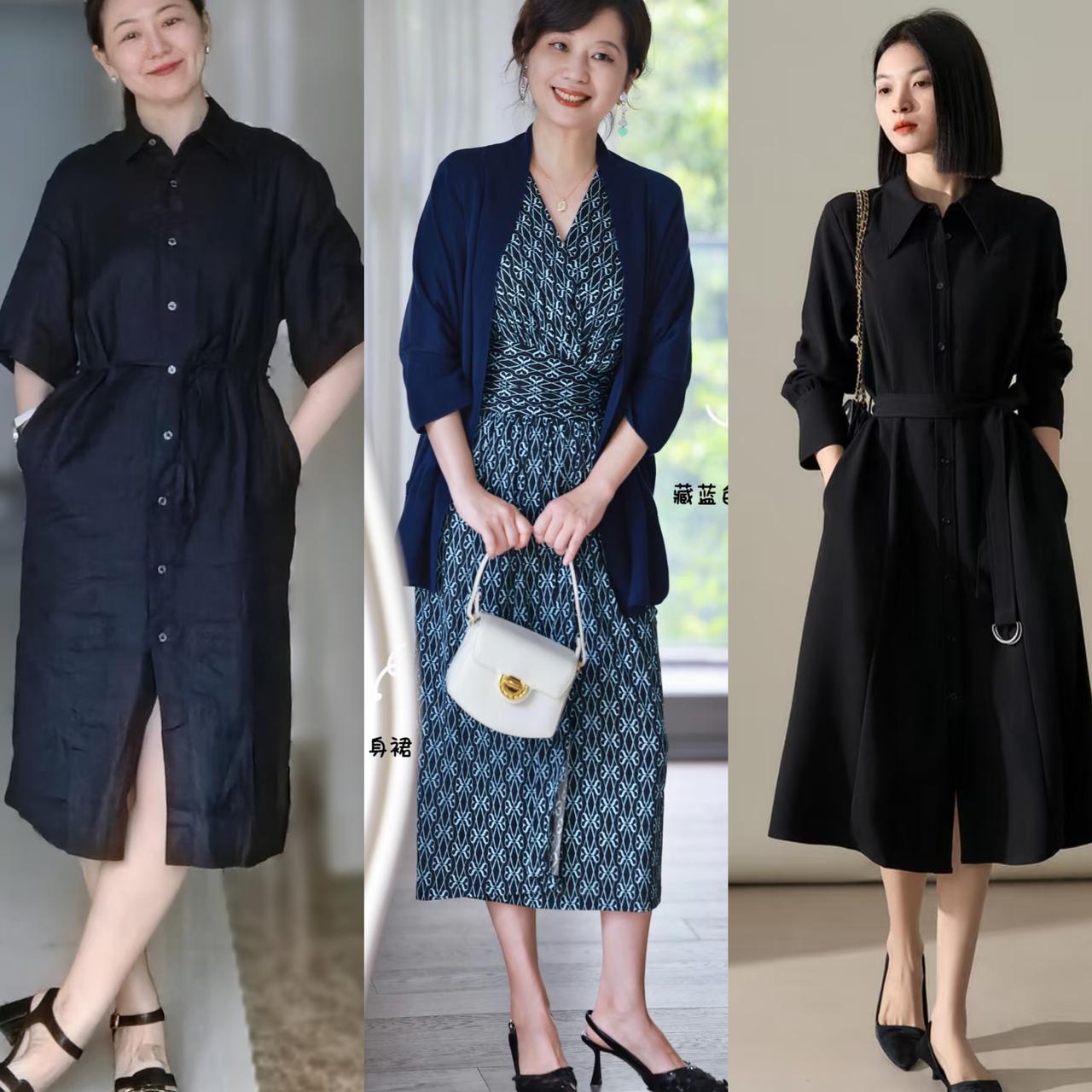 如果觉得浅色调连衣裙驾驭不了,可以尝试莫兰迪色系中的灰色调,如雾霾蓝、墨绿色、藏蓝色等,这些颜色相比深色更优雅,相比高饱和度彩色更稳重,关键不挑肤色和身材,随便穿都错不了。