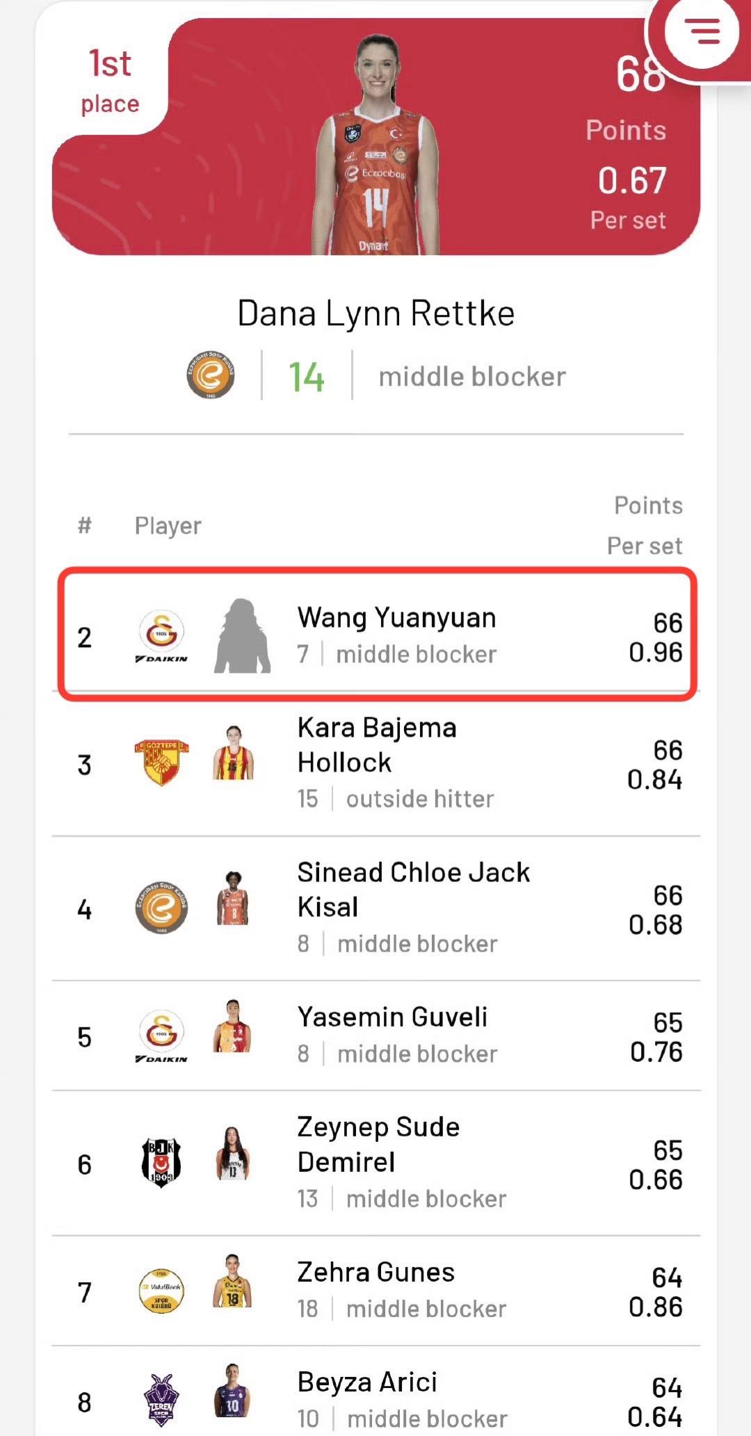 随着4月12日土超联赛5-8名排位赛次回合加拉塔萨雷3-2战胜土耳其航空晋级到5-6名排位赛,王媛媛凭借本场比赛中打出神级表现贡献的单场8拦,总拦网数66个一下子跃升至第二,把瓦基弗银行居内什的64个甩在身后,距离榜首只差2个,后面比赛将冲击并且有望获得总拦网第一,目前局均拦网0.96暂时排名第一!王媛媛继续加油!