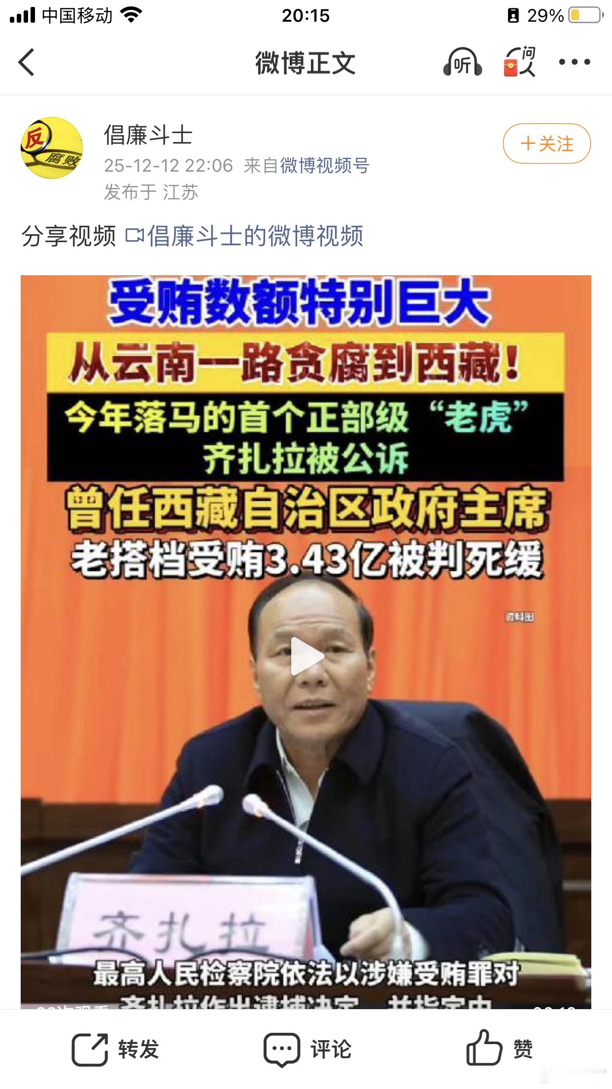 注意看西藏方面的消息:周末打虎,正部级丁业现落马。