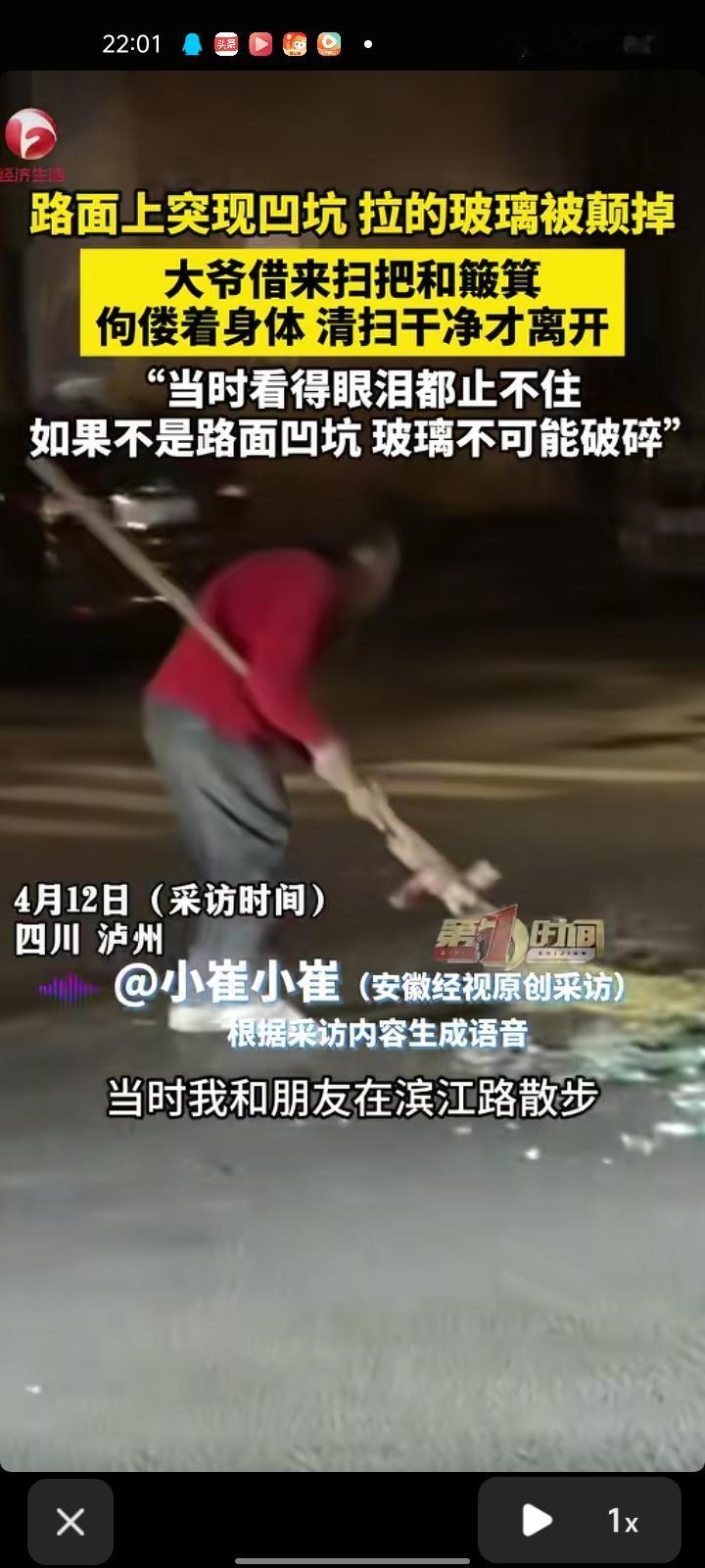 4月10日,四川泸州。女子和朋友散步时听到一声巨响,走近一看,是大爷的三轮车轧到窨井盖上了,接着哗啦一声,玻璃从三轮车掉下,碎了一地。紧接着,大爷借来扫把和簸箕,佝偻这身体,清扫干净才离开。有目击者称,如果不是路面那个坑,大爷不可能把玻璃摔碎,看着眼泪都止不住。