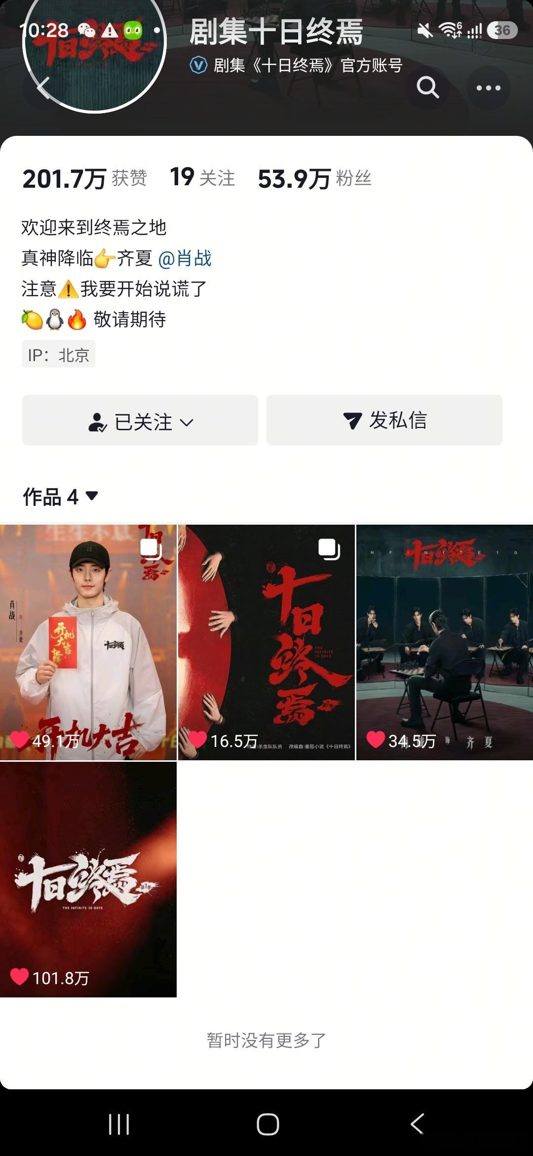 十日终焉首条百万赞视频 十日终焉官抖官宣肖战齐夏视频点赞2天破100万,肖战管微
