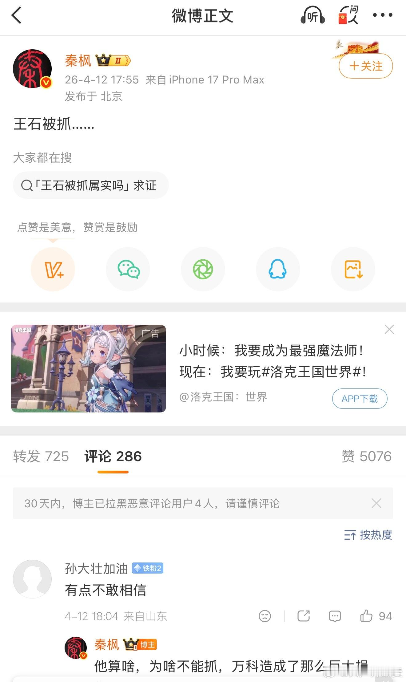 下午五点五十分左右,香港卫视的秦枫发了一条微博动态,就四个字——“王石被抓。”干脆利落,但就像一颗深水炸弹直接扔进了舆论场。