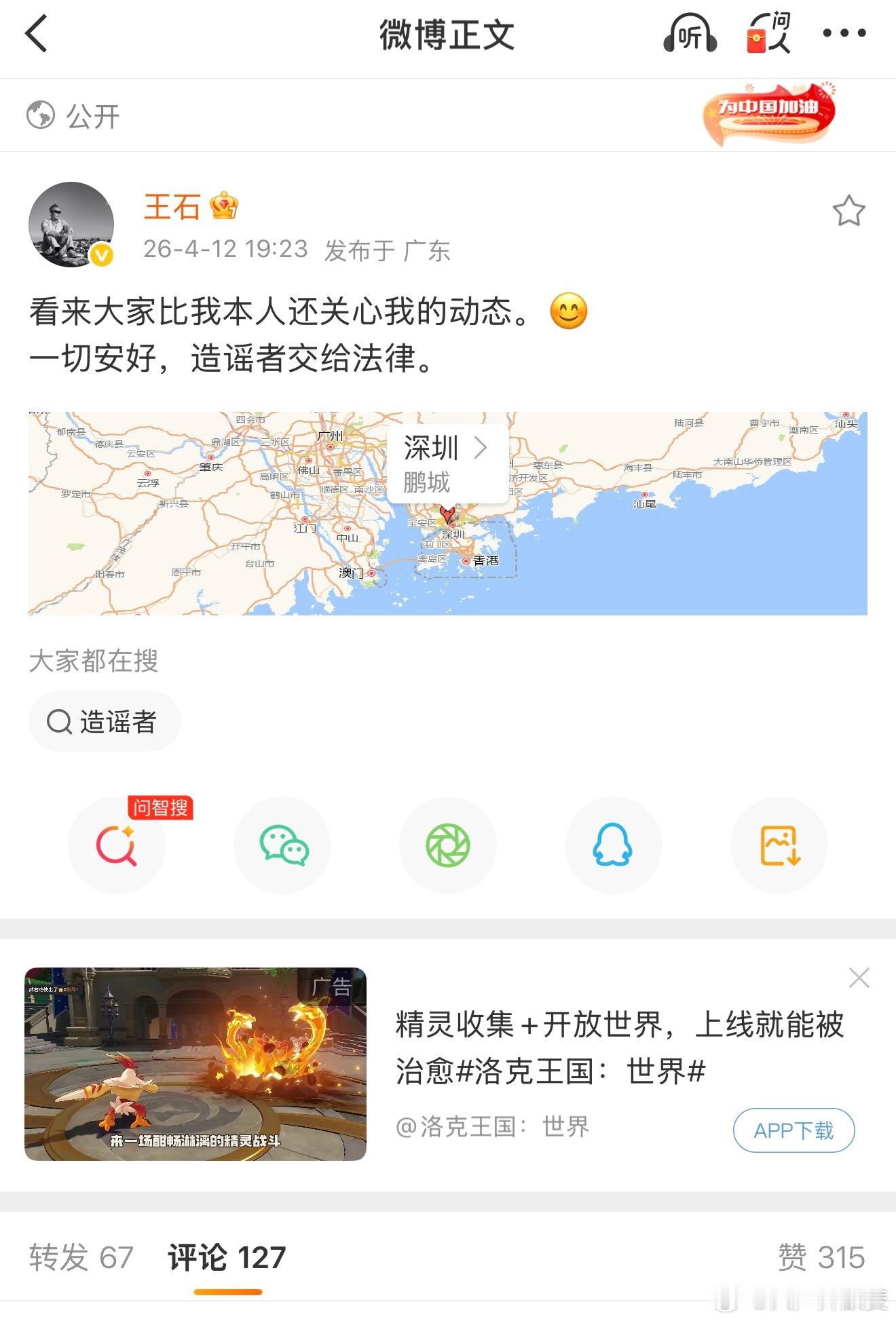 晚上七点二十三分,王石的微博账号直接甩出一条动态,定位广东深圳,原文是:“看来大家比我本人还关心我的动态。一切安好,造谣者交给法律。”短短三句话,等于直接把“造谣”两个字拍在了桌上。