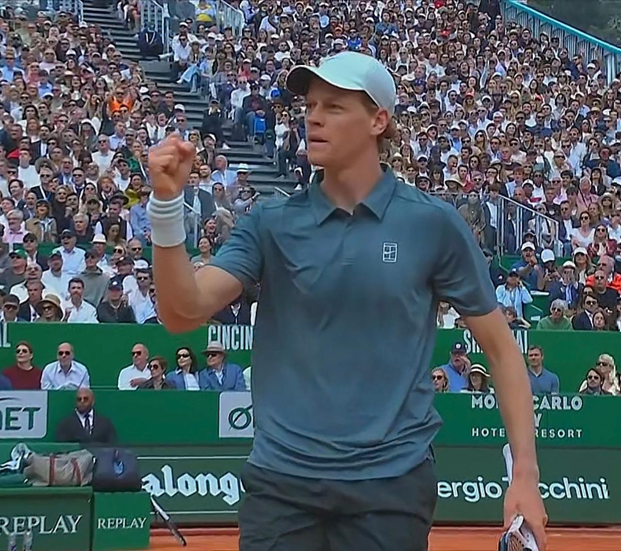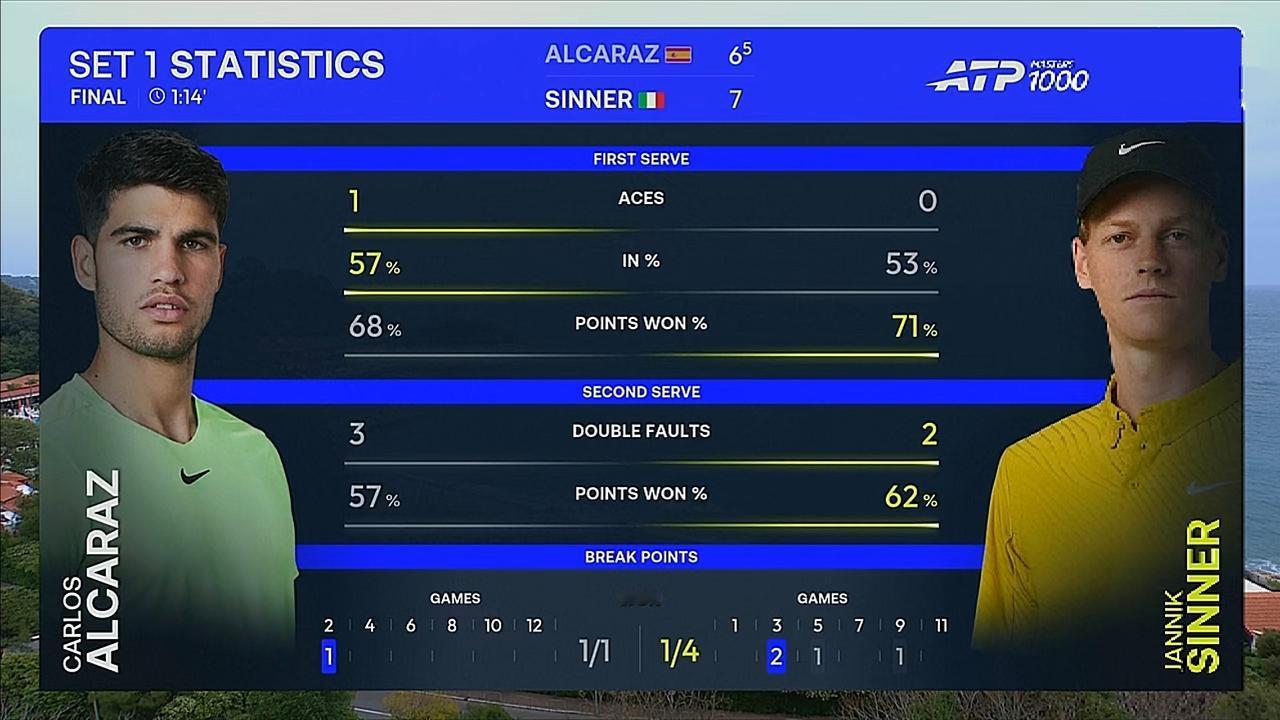 抢七局,辛纳4:2领先交换场地,随后拿到连续两个盘点,错失一个盘点后,阿尔卡拉斯发出双误,拱手交盘。