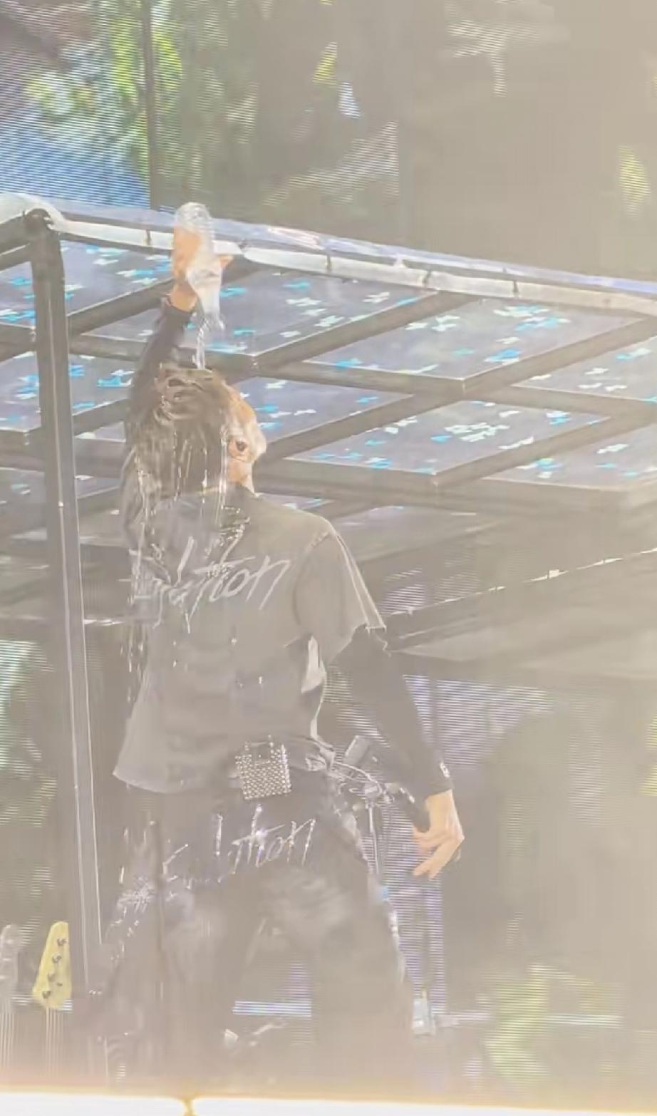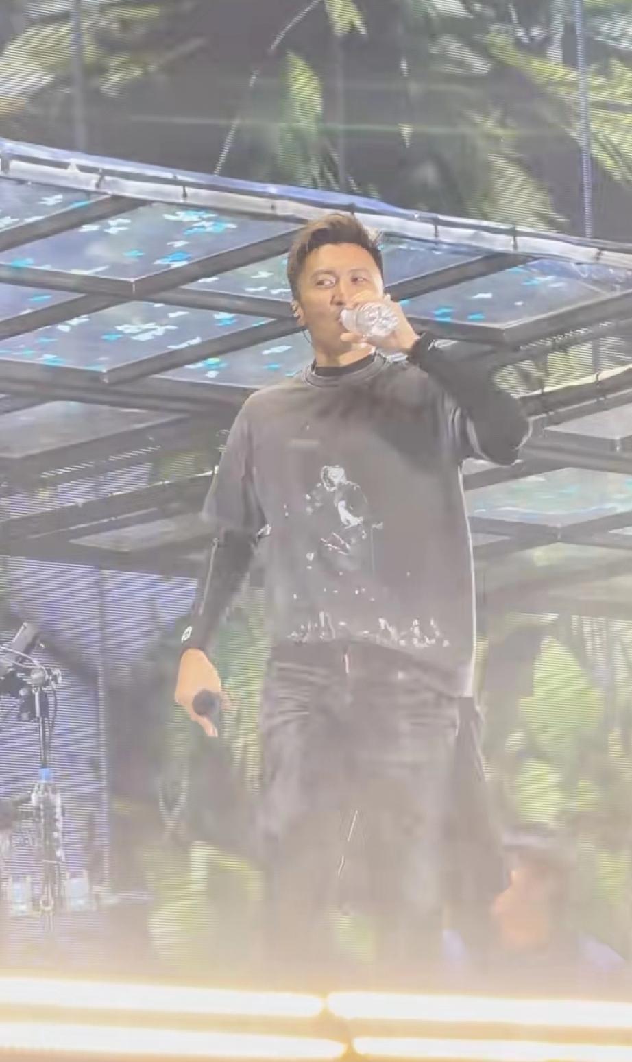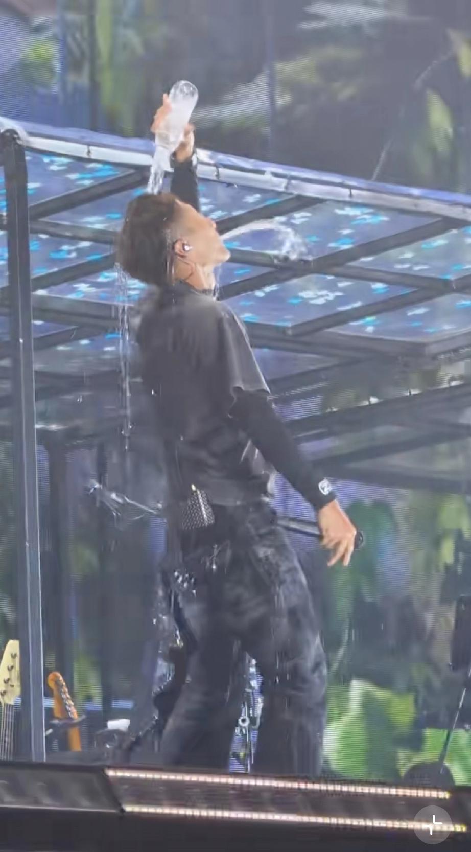 到了第2场,不下雨了,谢霆锋本来唱的好好的,竟然把手中正在喝的一瓶矿泉水拿起来直接从头上浇了下来,把衣服全打湿了。