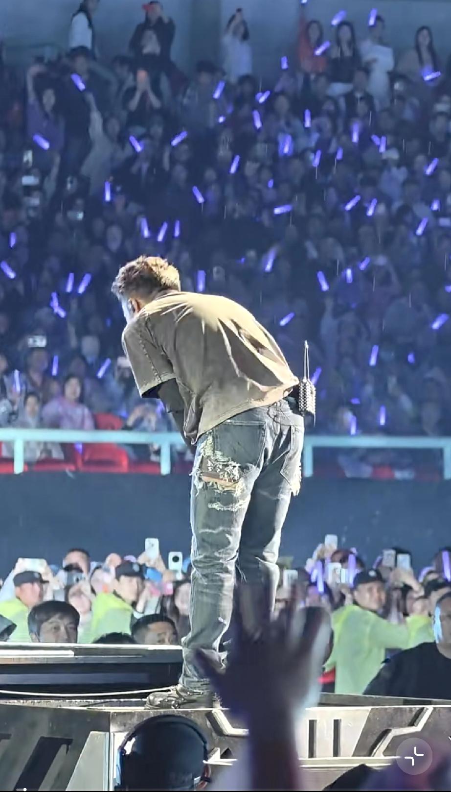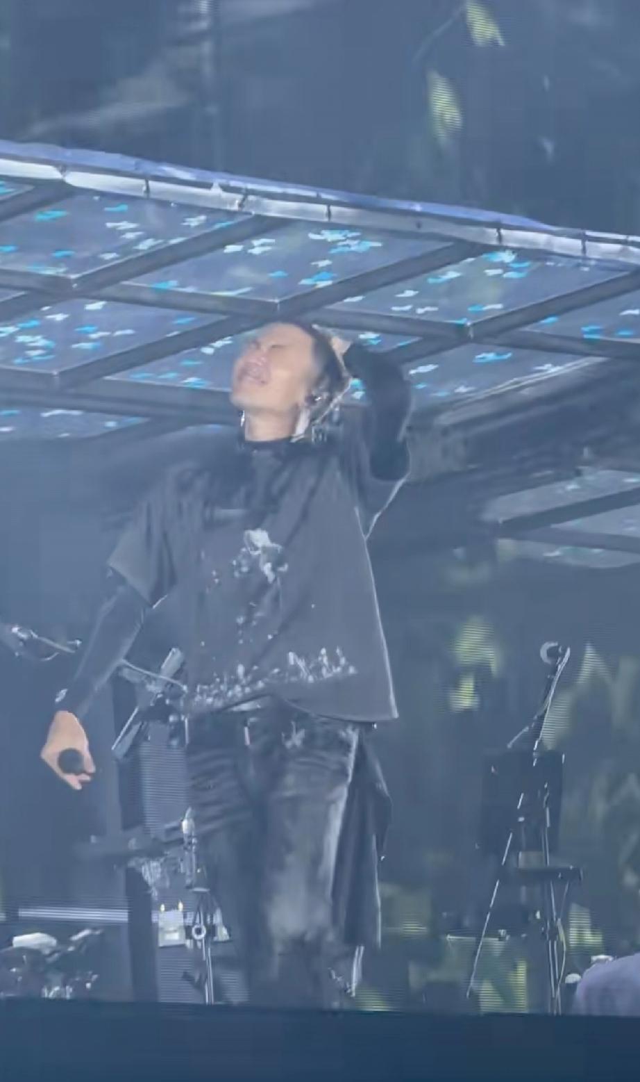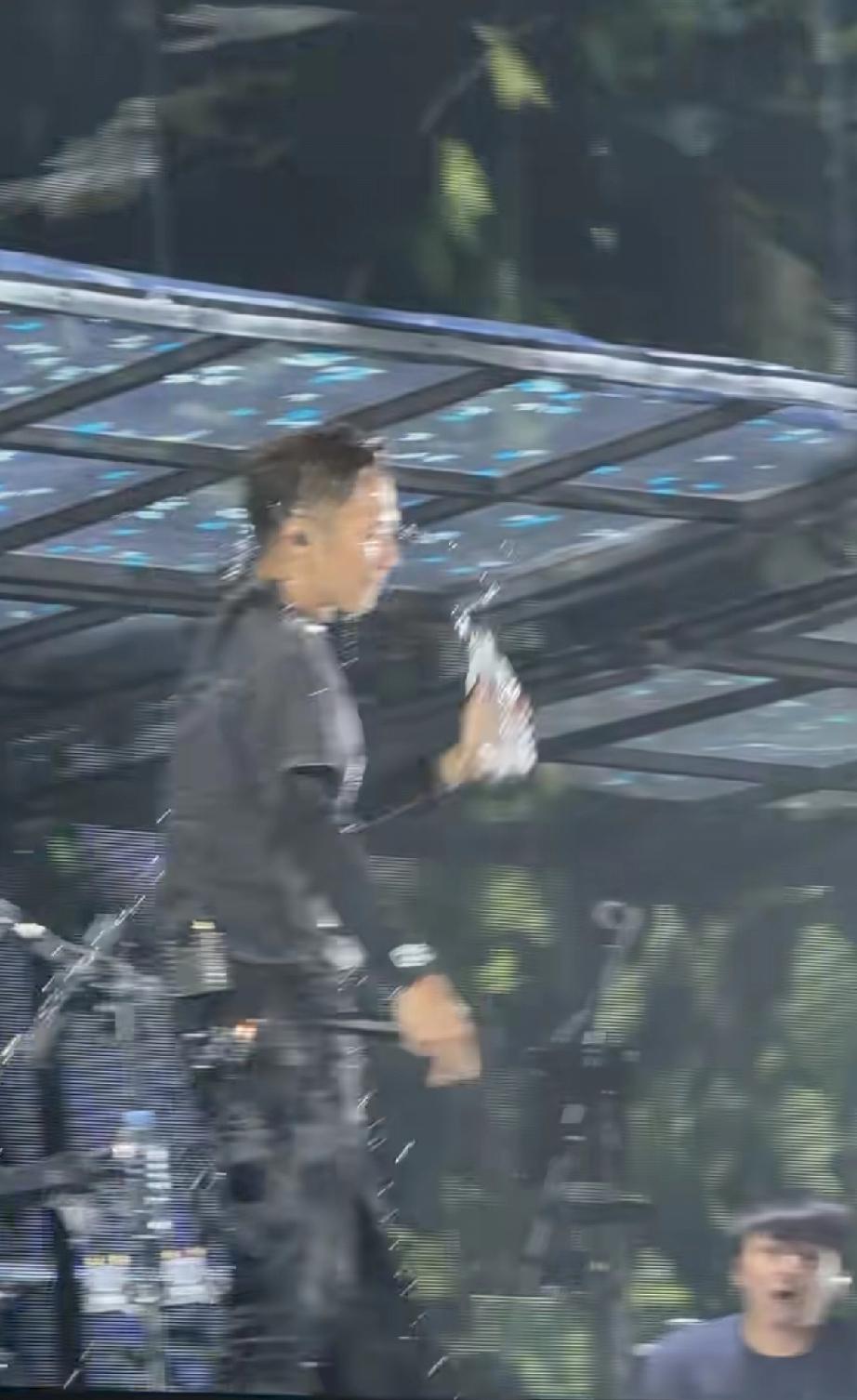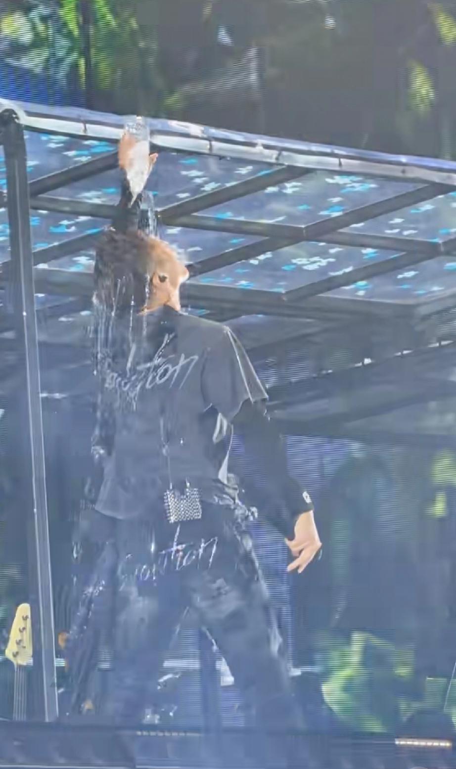 到了第2场,不下雨了,谢霆锋本来唱的好好的,竟然把手中正在喝的一瓶矿泉水拿起来直接从头上浇了下来,把衣服全打湿了。