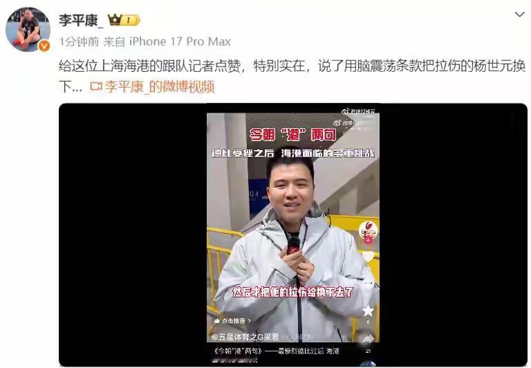 著名媒体人李平康透露,海港跟队记者证实,球队用脑震荡规则换下了拉伤的杨世元,这个事算是真相大白了。