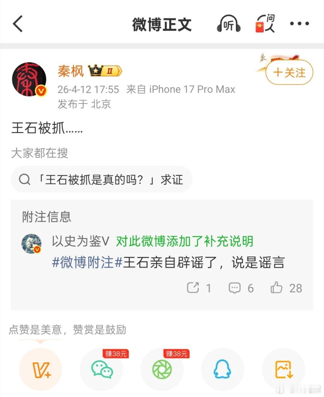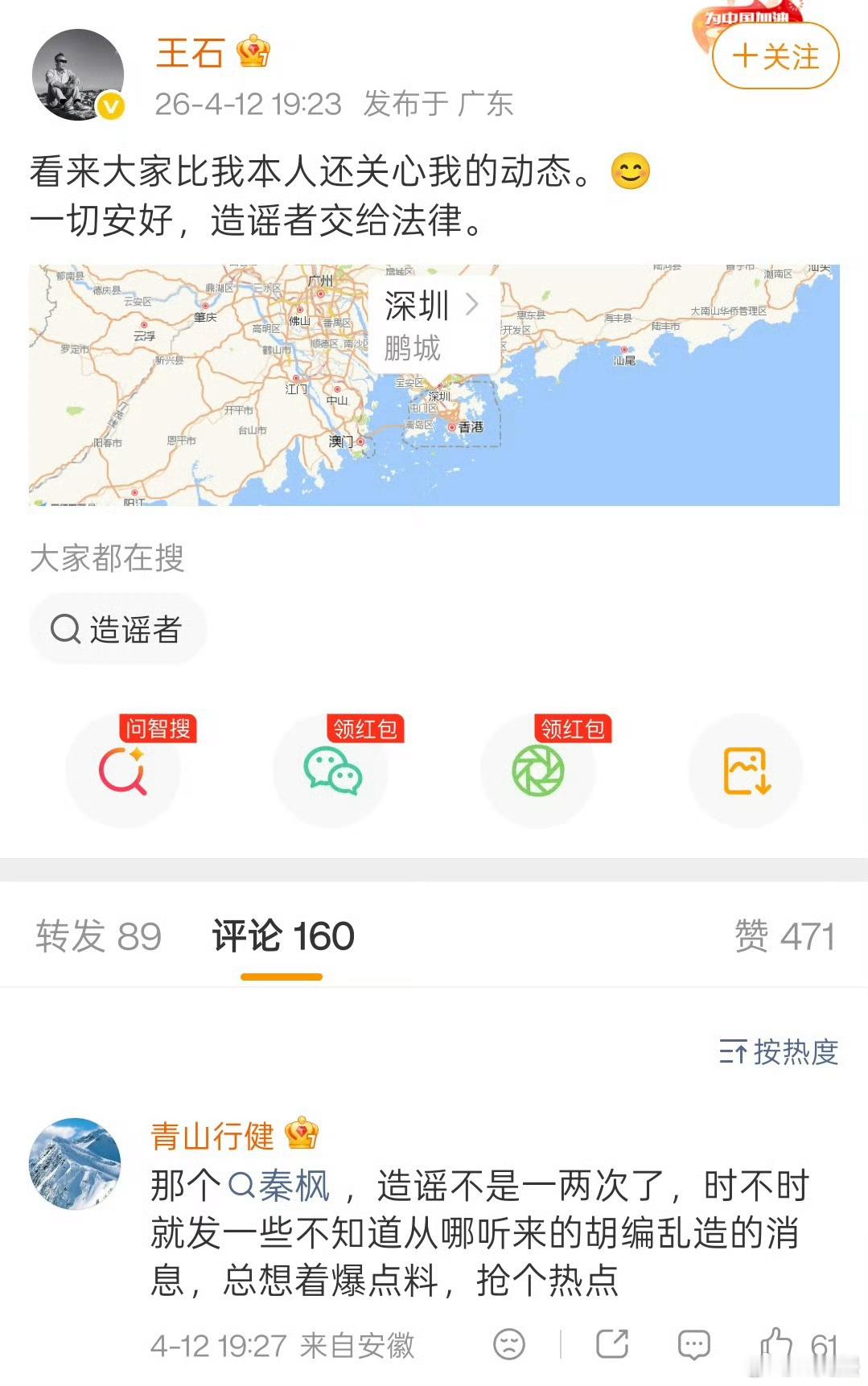 王石否认被抓人家夫妻俩都亲自出面辟谣了,还不打算删帖吗?刚查了一下这个秦枫,资料