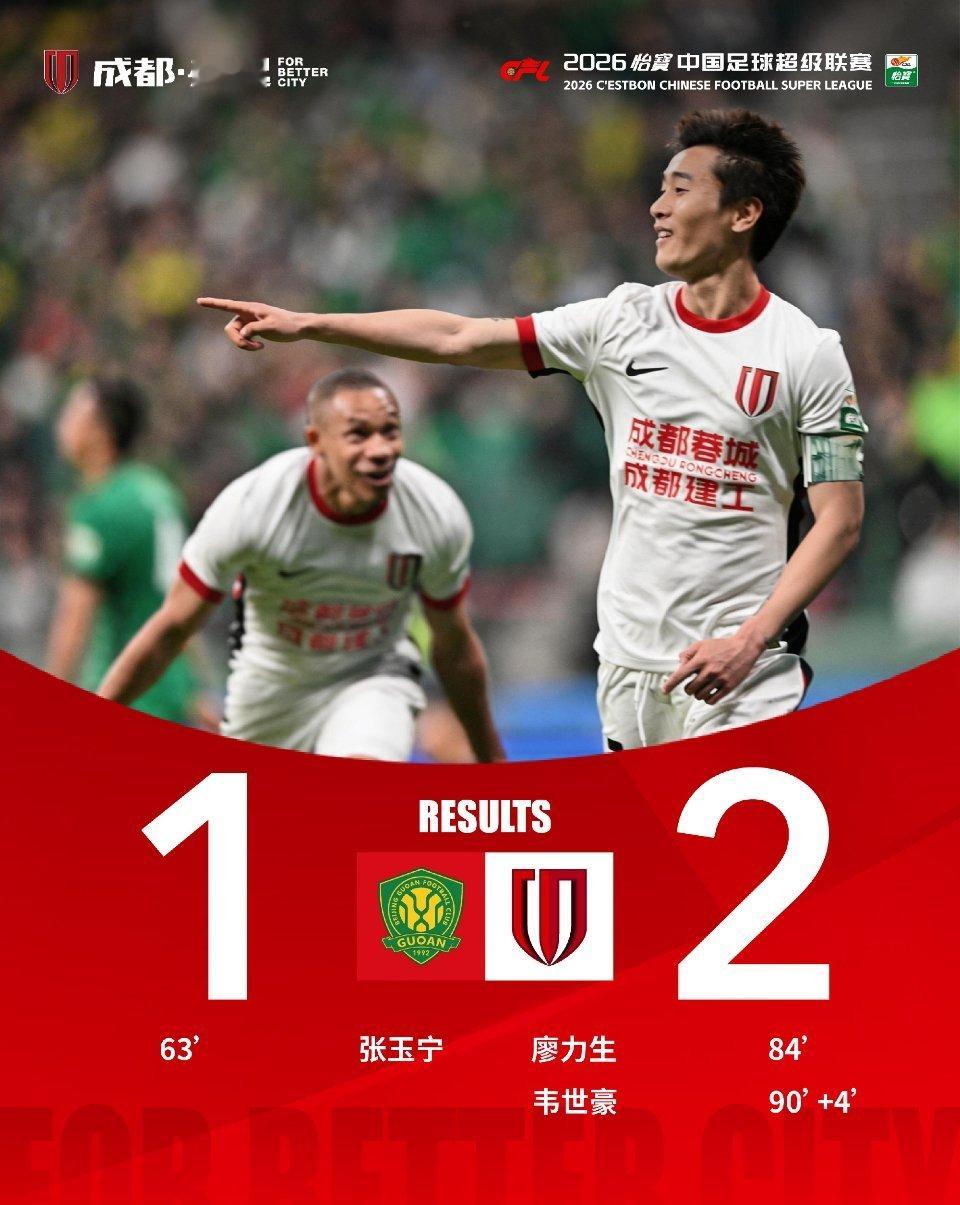 北京国安1比2成都蓉城补时一剑封喉!成都蓉城2-1惊天逆转工体,5轮不败领跑中超!这就是中超的魅力,不到最后一秒,永远不知道结局。韦世豪太硬了!84分钟扳平、94分钟绝杀,十分钟造两球,成都雄起!继续领跑,冲!韦世豪绝杀