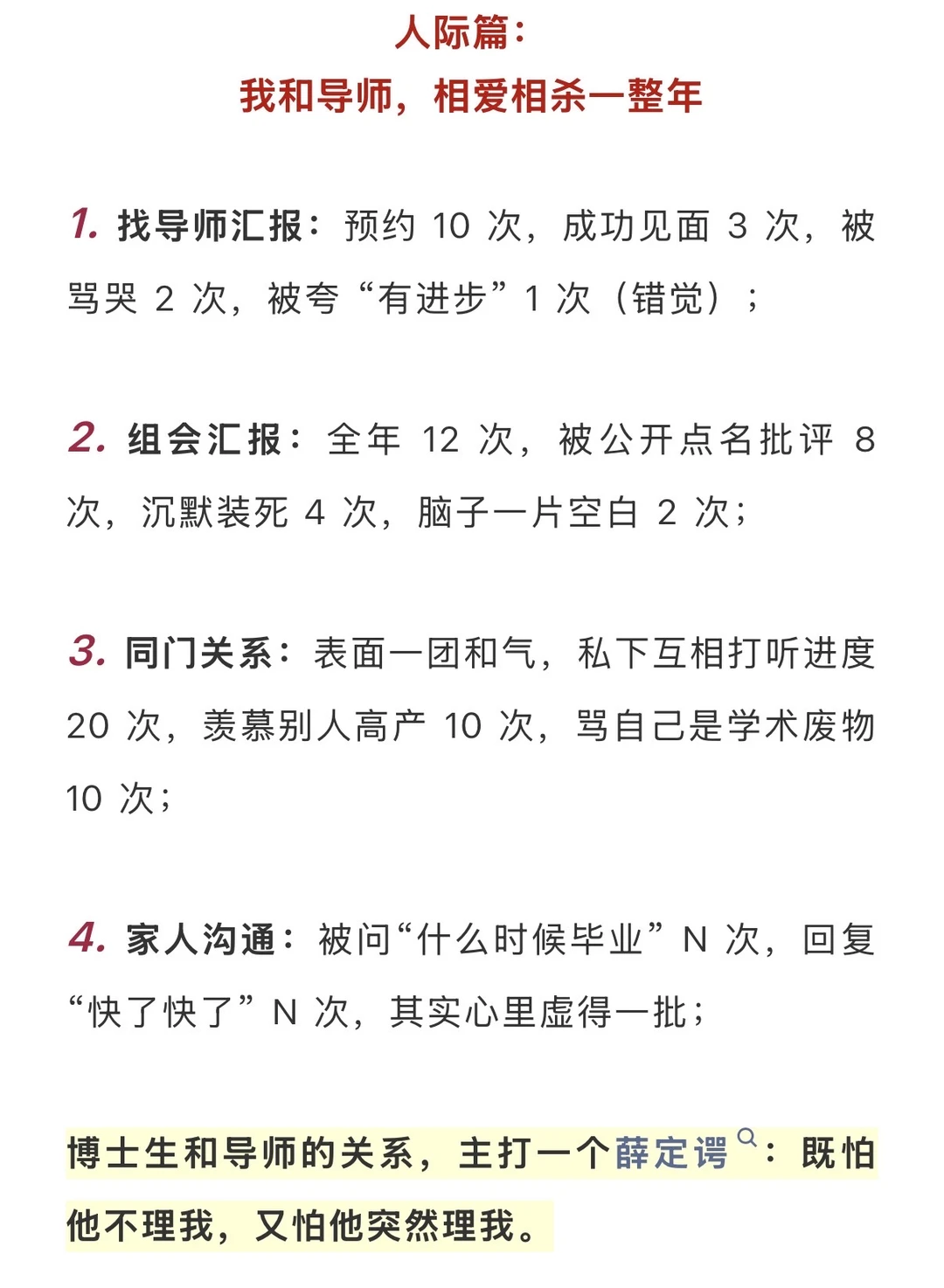 3. 找导师改论文 15次,预约排队等召见8次,被骂到狗血淋头打回重写5次,听懂人话修改意见3次,剩下12次全靠瞎猜导师的暗语;