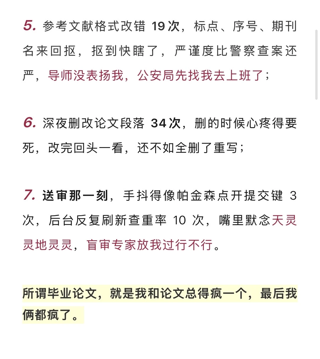 5. 参考文献格式改错 19次,标点、序号、期刊名来回抠,抠到快瞎了,严谨度比警察查案还严,导师没表扬我,公安局先找我去上班了;