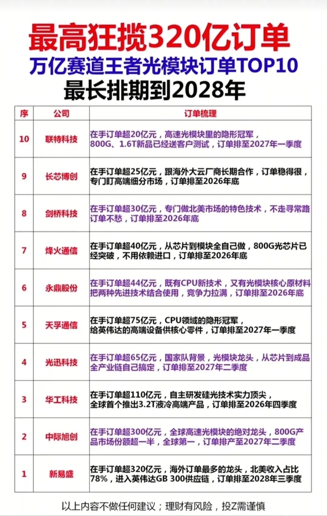 业绩爆单,订单排到2030年,业绩爆发肉眼可见!国产存储芯片订单最高狂揽380亿,排期直达2028年底;绿电赛道王者订单超2000亿,最长排期到2030年;锂电池领域龙头手握1500亿订单,排期冲到2030年;创新药企业年报业绩最高暴涨超3000%;光模块赛道龙头订单超320亿,排期至2028年三季度;光通信国家队迎来全球需求缺口,价格同比暴涨418%!从算力核心到能源基建,从医药创新到通信升级,六大高景气赛道的核心龙头、订单规模、行业地位全梳理,一眼看懂未来3年的产业主线。