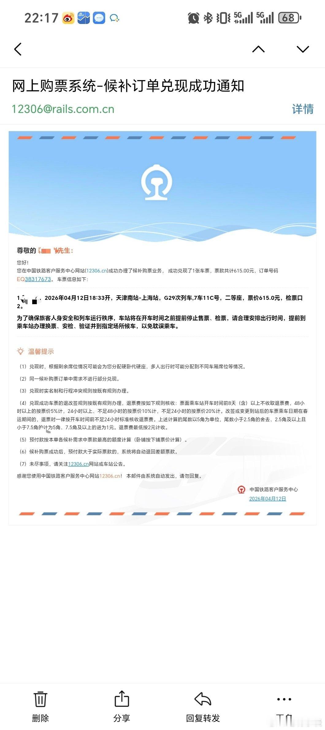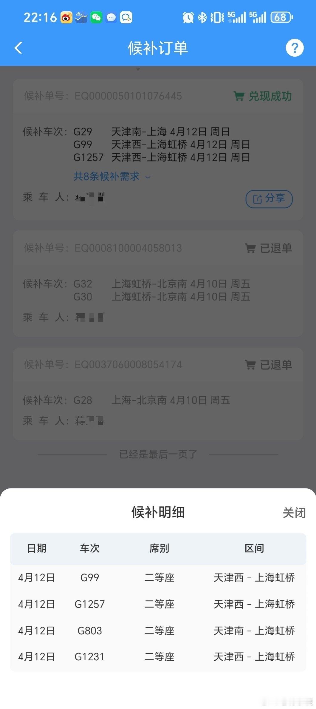 下午2点:我候补8个车次,付了620元。下午4点11分:担心候补没戏,又买了924元的一等座。下午4点23分:候补成功了!615元的二等座。下午4点40分:退掉一等座,被扣了185元手续费(20%)。