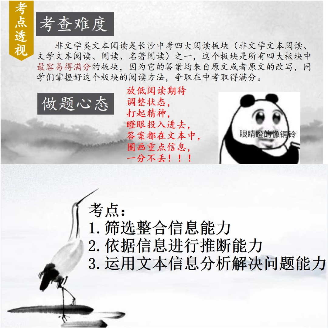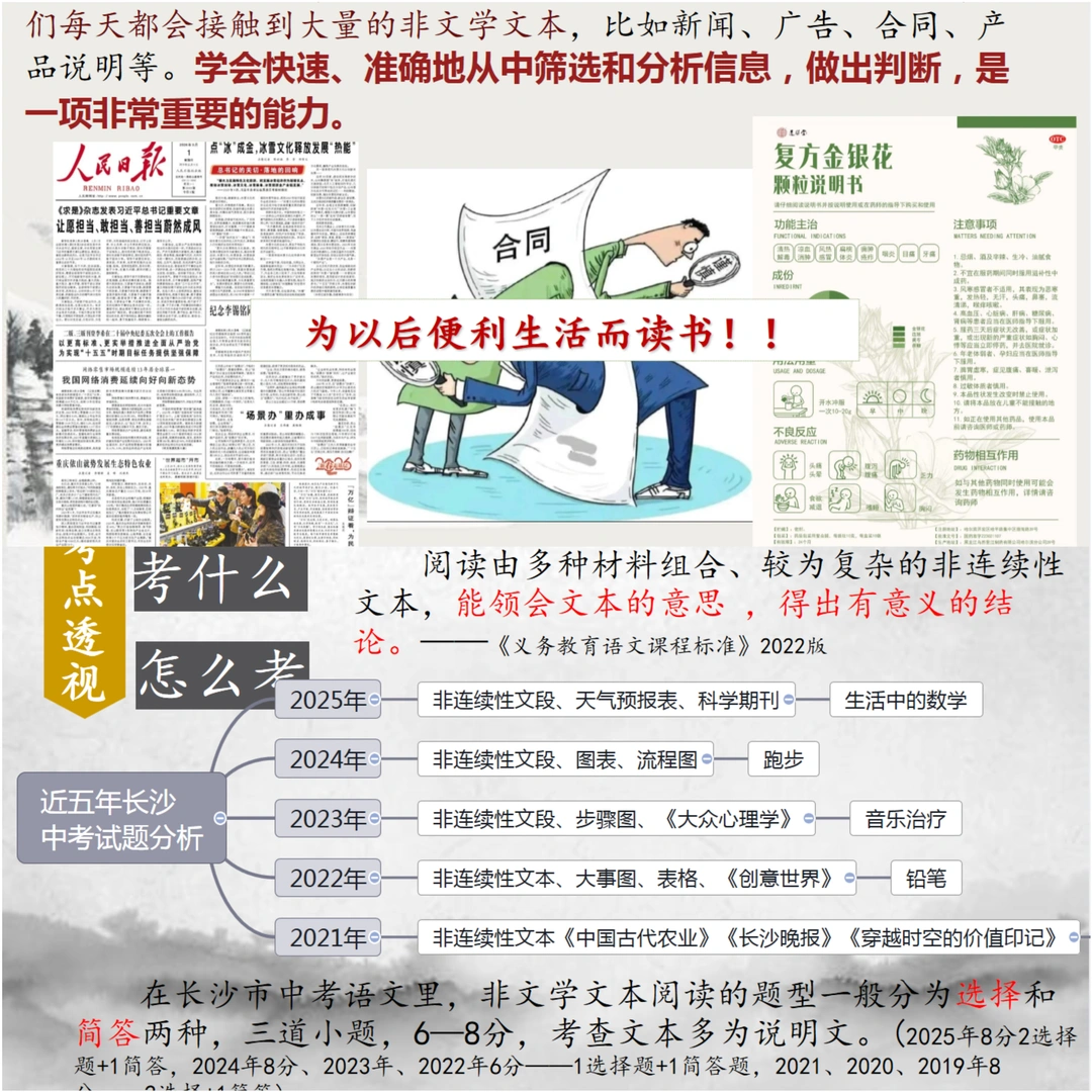 仔细研究近几年长沙中考真题就会发现,现在的现代文阅读里面的非连变成了非文学作品阅读,向高考的方向靠近,依旧不爱考议论文。
