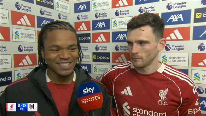 罗伯:绝对不会。我们回更衣室再好好“聊聊”这个!他表现太不可思议了。这也说明,有时候真别听老队员的。我当时大喊着告诉他我要套边插上,结果他直接内切打门了。他的射门非常精彩,整场表现也很出色。他一直在学习、一直在倾听,是个非常棒的孩子。这话我只在镜头前说,不当面跟他讲!说实话,我很乐意和他还有特雷一起共事。他们愿意倾听队内所有球员的建议,你能看到他们一直在进步。他前途无量,而当下的表现也已经足够出色。