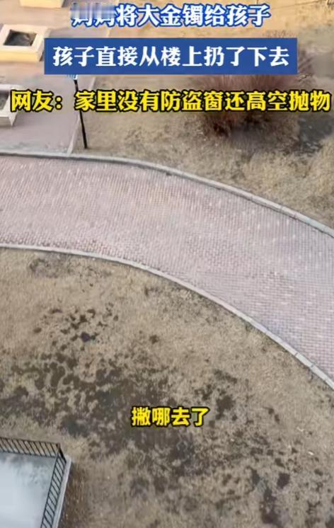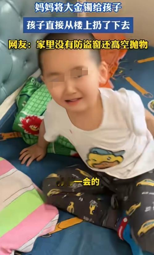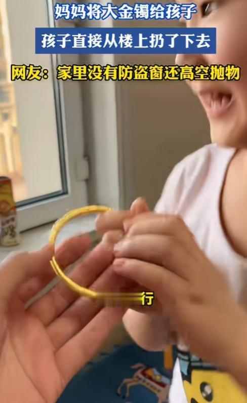 再看,高楼层,窗户又这么矮,没有防盗窗,还挨着床,这对孩子来说就是巨大隐患。这回扔下去的是“大金镯”,明天万一孩子自己攀爬失足,那就是天大的悲剧。