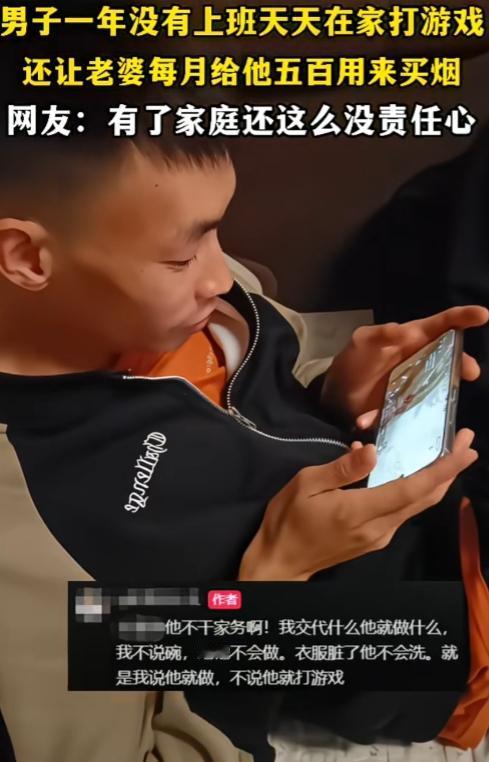 不明白这男的有啥地方能让他老婆如此着迷的?一年没上班,天天在家打游戏,不干家务活,还让老婆每月转五百用来买烟。
