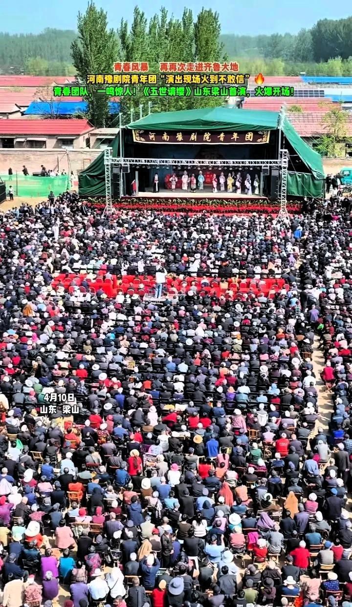 六万人聚集,公安在现场维持秩序,120救护车现场守候,群众热情空前高涨,山东梁山