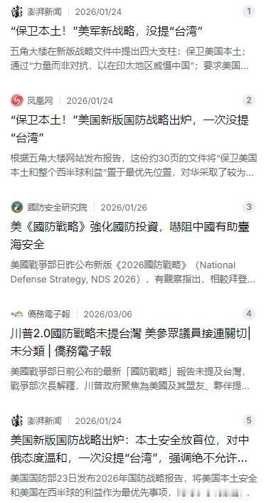 美国国防部在2026年1月23日发布了新版《国家防务战略》报告,全文大约30页,把“保卫美国本土和整个西半球的利益”放在了最优先的位置。跟2022年的版本相比,这个变化挺大的。2022年的报告里四次提到了台湾,而这次是一次都没提。