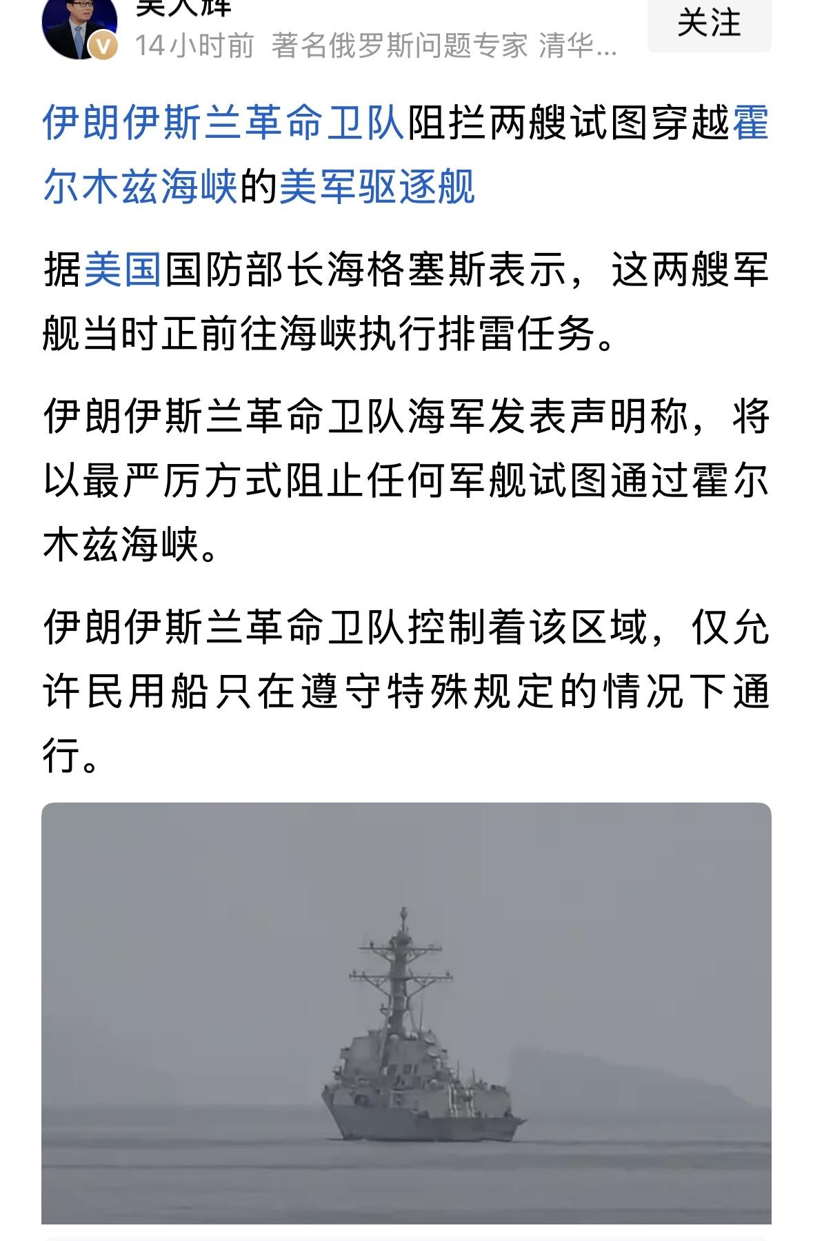 美军舰进入霍尔木兹海峡,伊朗革命卫队要求美军舰立即立即离开,否则全部击沉,川普生