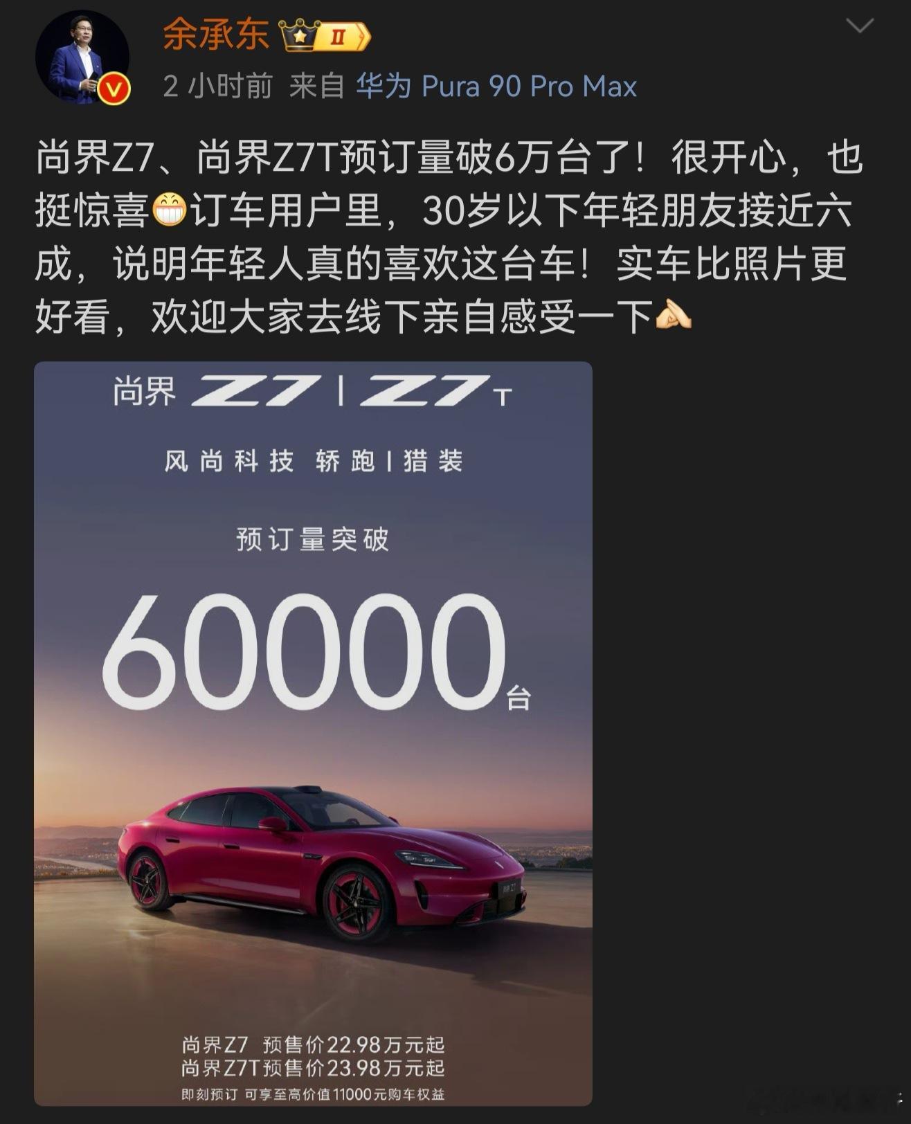 问界M6预定量破10万台尚界Z7/Z7T 预定量破6万台