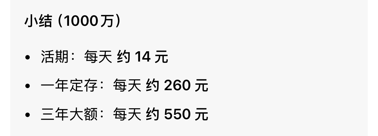 算了一下,拿1000万放在银行里一年定存:每天约 260 元。三年大额:每天约 550 元。如果存3年大额,一个月就有16500元,这不比上班强的多?