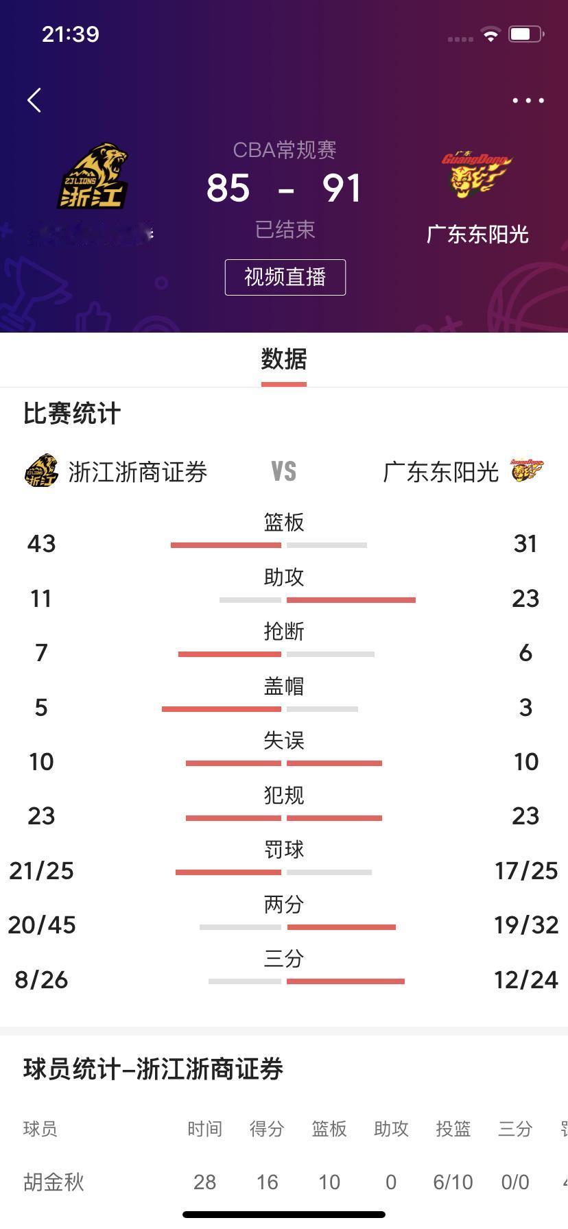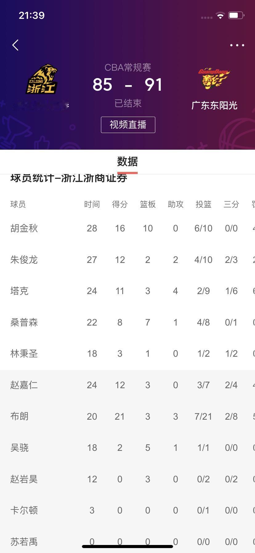 在刚刚结束的卫冕冠军浙江浙商证券男篮主场迎战广东东阳光男篮的比赛中,浙江队最终以85比91输了!