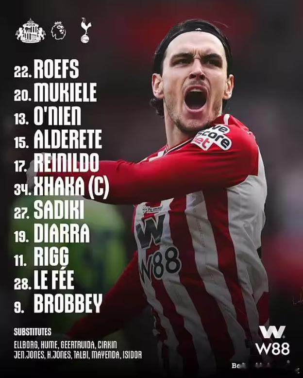 桑德兰首发:22-罗夫斯、20-穆基勒、13-奥尼恩、15-阿德雷特、17-雷尼尔多、34-扎卡、27-萨迪基、19-迪亚拉、11-里格、28-勒费、9-布罗比
