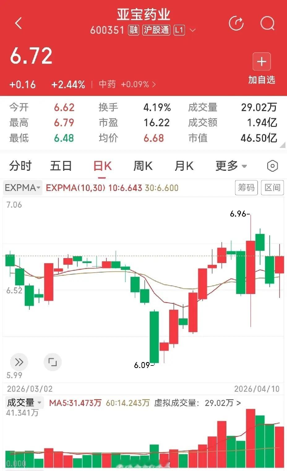 济民健康,四连阳之后三连阴,能否企稳需要观察。是一个医药医疗路线的跟随者,如果再有个大长腿,就好看了。哈药股份,涨停板后的回调,周四的绿色上影线似乎太长了点,周五的小阳线又似乎稳了一点,周一如果不再下跌,不破生命线就好了。亚宝药业,两阳夹两阴,两个阳线都是大长腿,美不美?静态图片只能欣赏,具体如何做,只能看盘中动态情况而定。