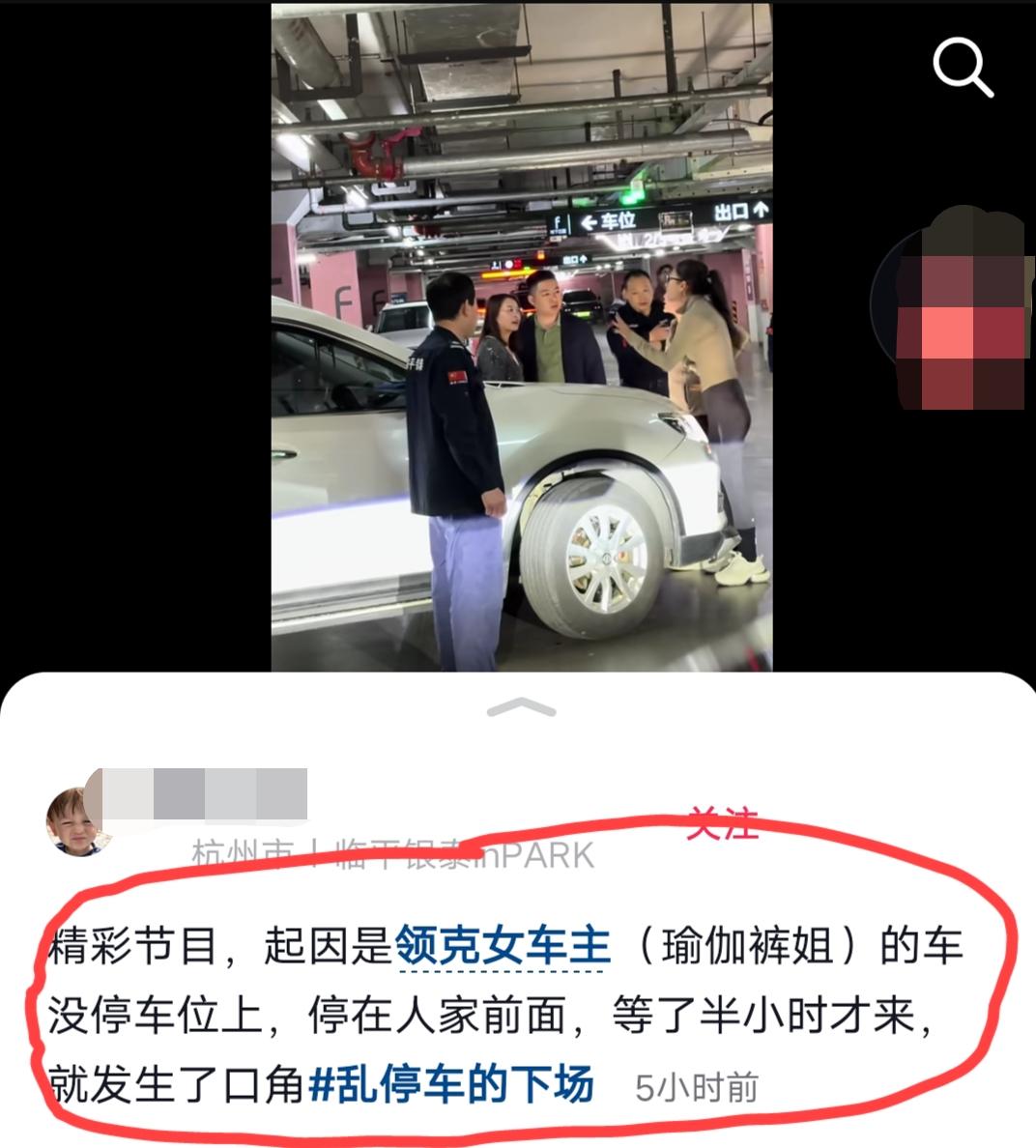 浙江杭州,发生在车库的一起纠纷,起因大概是领克女车主(穿瑜伽裤的女子)把车停在过道上走开了,导致左边夫妻俩的车出不来,等了半个小时再来,就发生了争执。最后,把后面的车都堵住了,保安就让他们不要吵了,先把车动一下,戴眼镜穿瑜伽裤的女子直接来了这么一句:“挪不了,他不给我道歉动不了”……