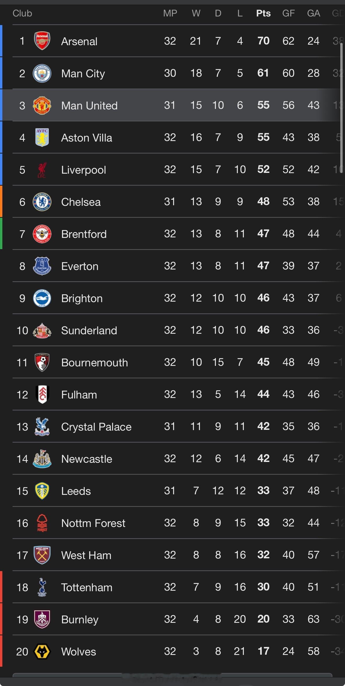 都忘了报这个比分!维拉丢分了曼联少赛一场还在第三