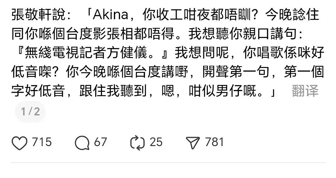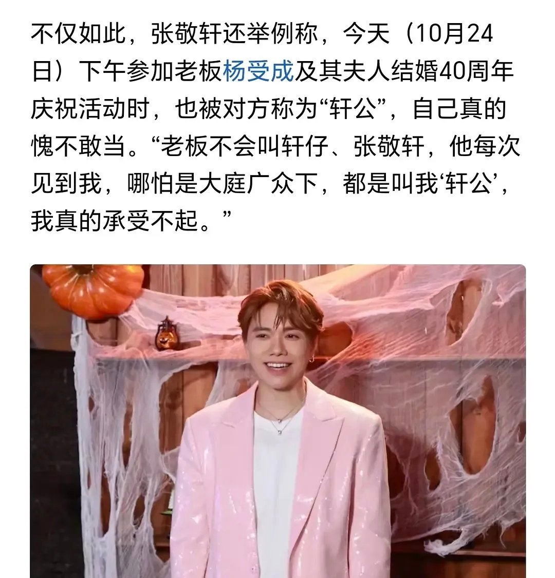 张敬轩在社交媒体自称轩公,出的综艺叫“轩公敲碗”,在林峰的演唱会上自称轩公,拍广告时自称轩公,出的周边叫轩公,他的老板英皇董事长杨受成用“轩公”一词称呼他,他笑着说荣幸,不敢当。。却又在原TVB主持人方健仪称呼他轩公时表达不满,甚至阴阳怪气提起对方TVB出身(人家已经离巢十几年),导致方健仪被他粉丝网暴,方健仪不得不向他和粉丝道歉。