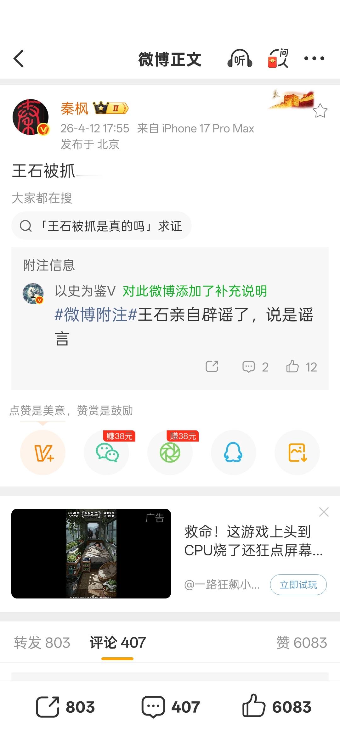 王石否认被抓本尊出来辟谣了,秦枫还没有删。
