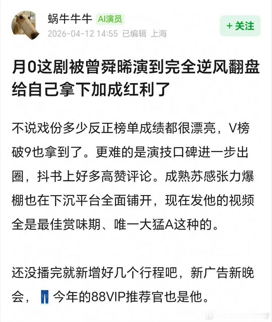 曾舜晞完全逆风翻盘曾舜晞给自己拿下加成红利 真的被曾舜晞的敬业和实力打动!就算是小成本剧,也用百分百的演技演绎,硬生生逆风翻盘,拿下属于自己的加成红利!