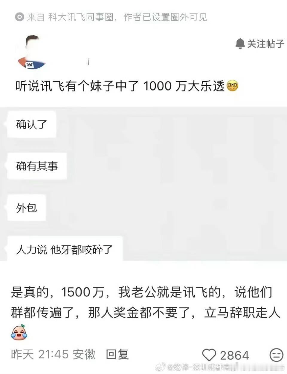 网传科大讯飞员工中了1500万彩票后直接离职!中大奖还传的全公司都知道,是别