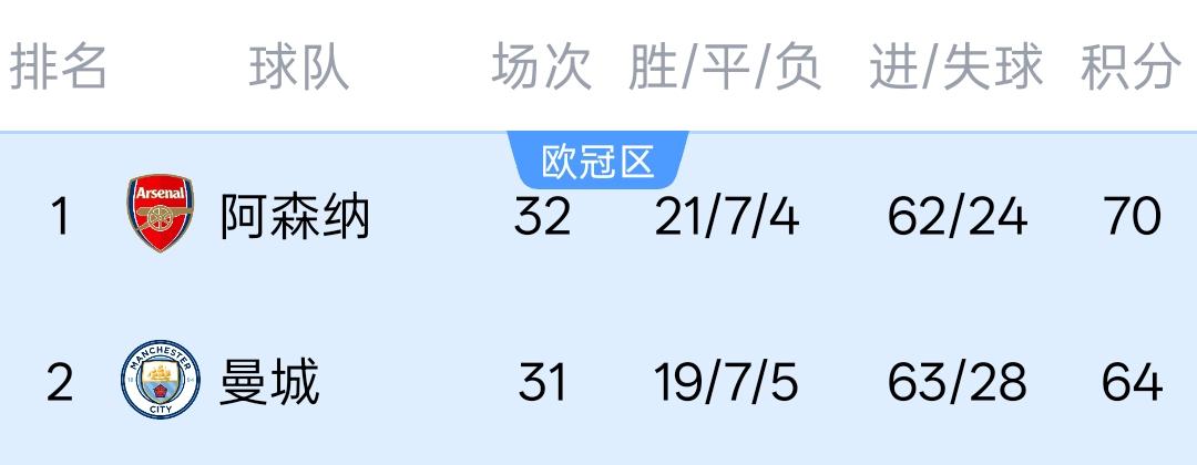 这就意味着只要在下轮比赛直接对决中战胜阿森纳,再赢下对阵伯恩利的比赛,曼城就能够凭借净胜球优势反超阿森纳,在冠军之争中占据主动位置!