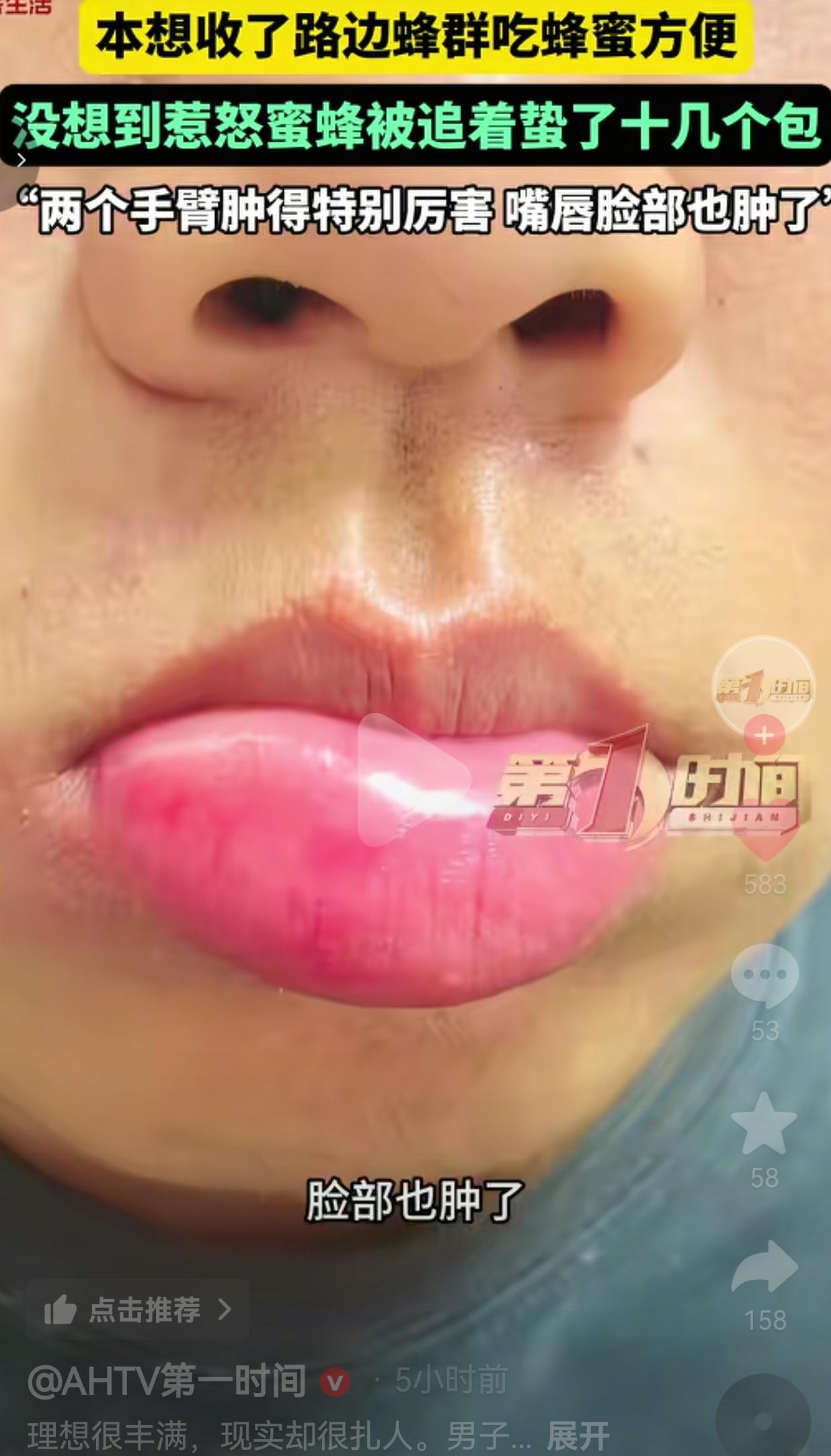 笑到拍大腿!河南息县孙先生看网上收蜂简单,就想把路边蜂群收回家养着吃蜂蜜,结果操作失误惹怒蜂群,被追着蛰了十几个包,两个手臂肿得老高,嘴唇脸全肿成了“猪头”!