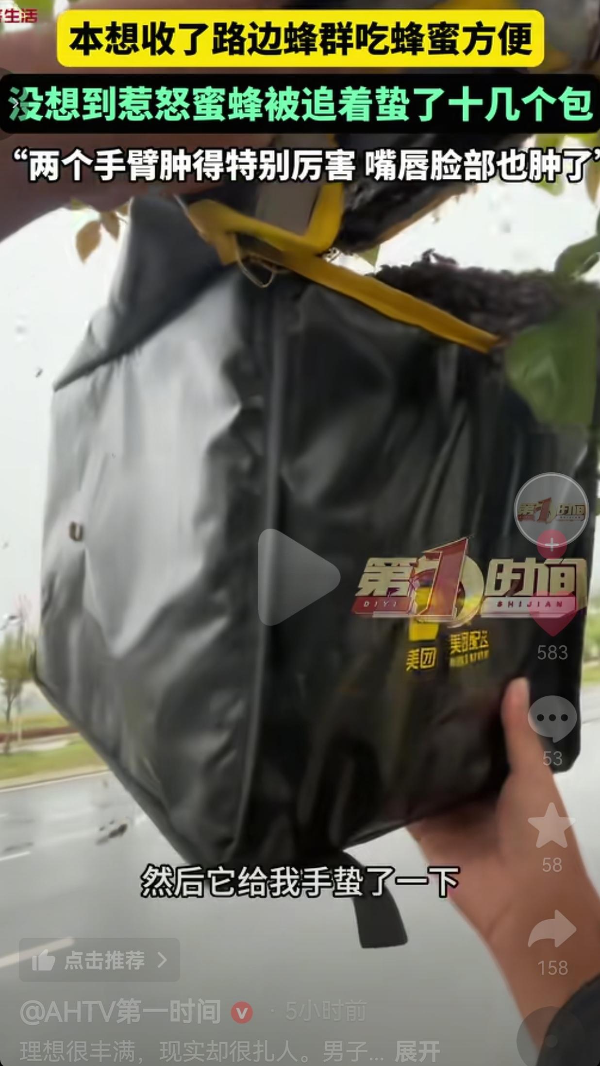 人家专业养蜂人都是穿防护服、喷烟驱蜂,一步一步来,你倒好,拿个外卖箱就敢硬薅,这不叫勇敢,这叫作死!