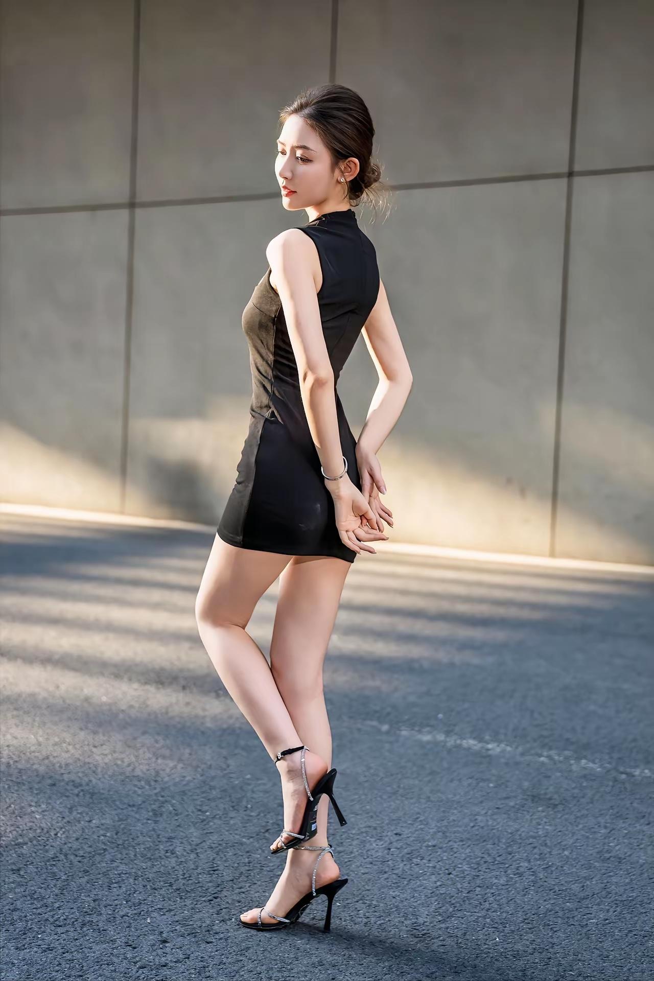 时尚车模程儿,黑色礼服与霓虹灯光的完美融合。