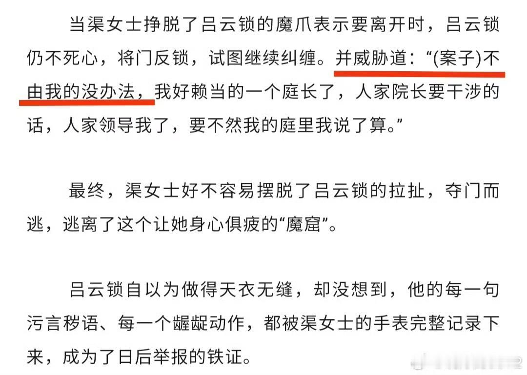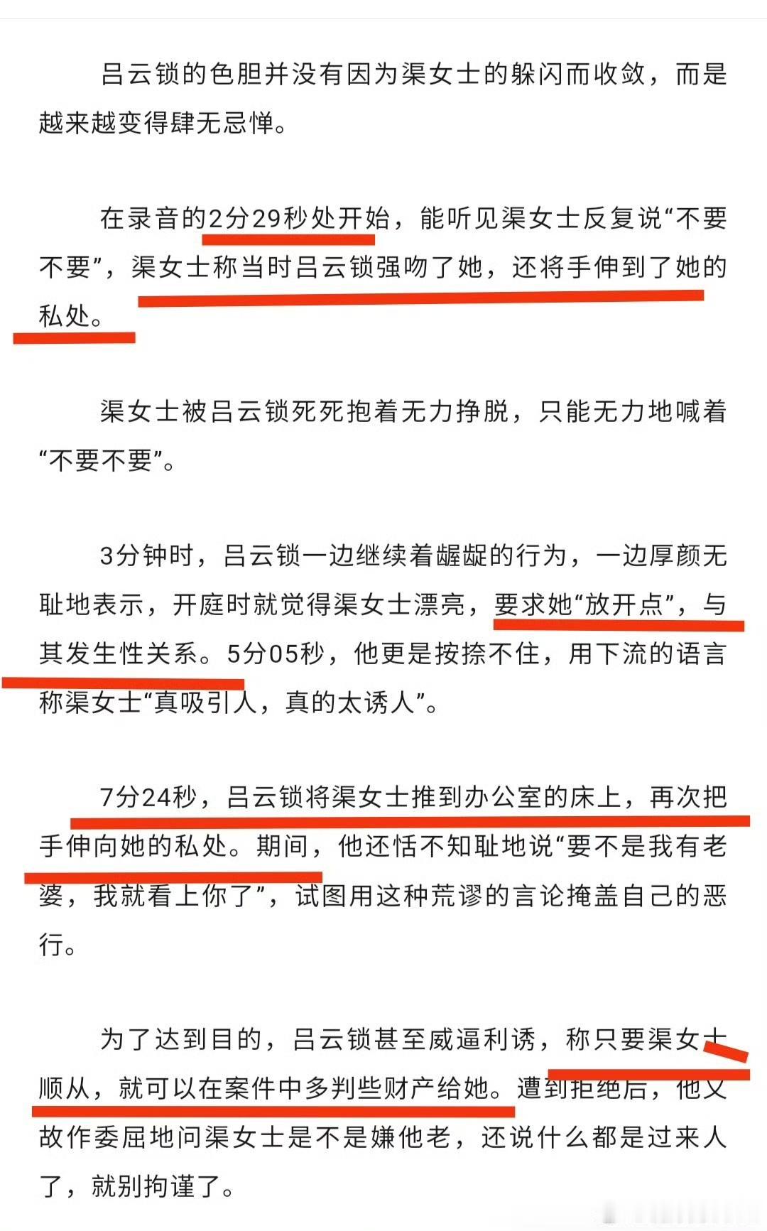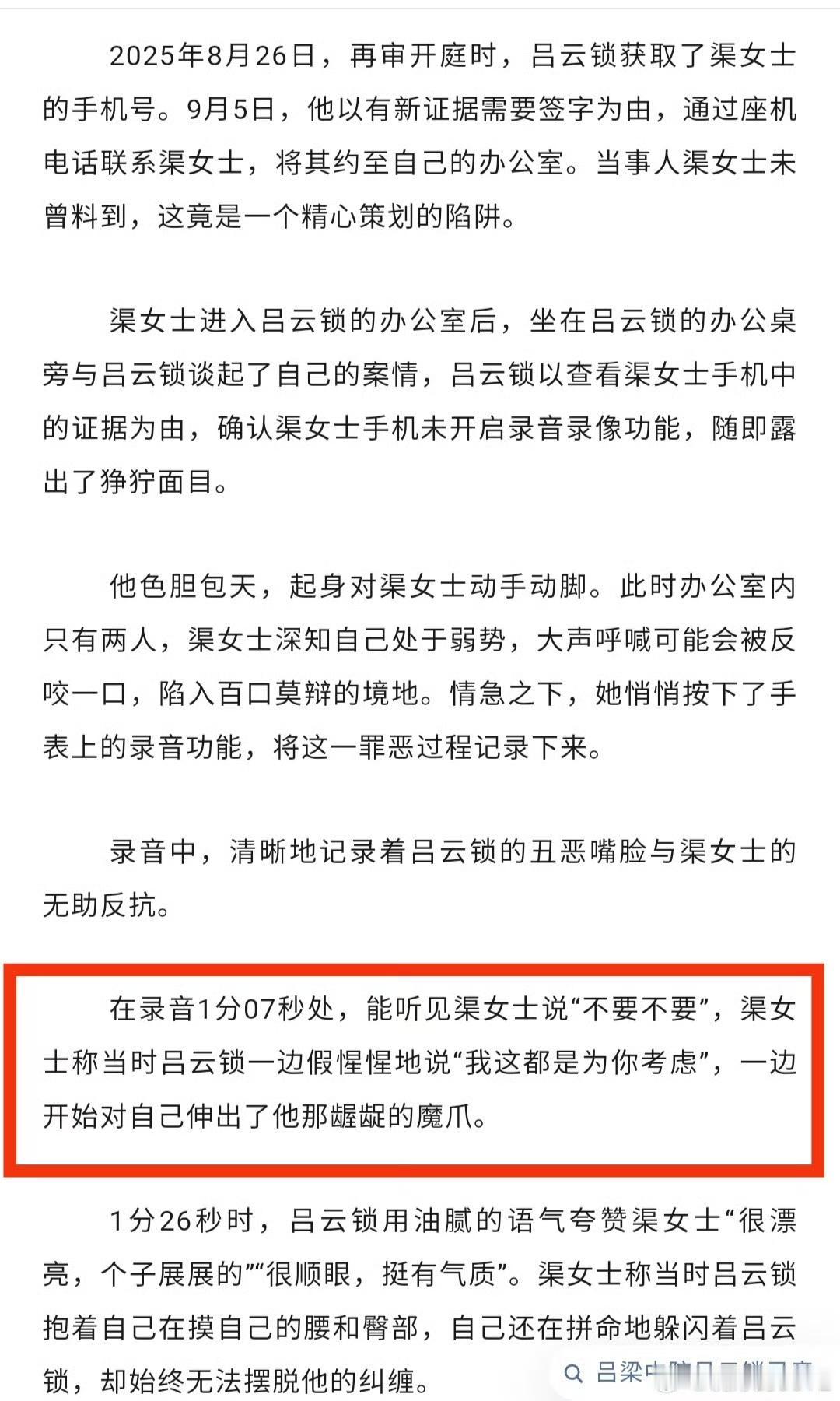 山西吕梁的渠女士举报吕梁中院法官吕云锁猥亵 ,长达 7 个月都没有官方受理,如果没有那一段 16 分钟的录音,没有媒体的公开报道。只怕她的冤屈将无处可伸,这才是让普通老百姓不寒而栗的地方。因为一场离婚官司,漂亮的渠女士被吕梁中院审判监督庭的吕云锁暗中给盯上了。他利用职务便利私自联系曲女士,9 月 5 日邀约她到自己的办公室核实所谓的证据,这应该是他事先计划好的。在他的办公室里面对渠女士进行猥亵,渠女士戴的手表有录音功能,她偷偷开启了。好不容易逃出吕云锁的魔爪,渠女士并没有被吕云锁的淫威所屈服,勇敢的向吕梁中院院长、纪检组进行举报,但是一直石沉大海。这种屈辱的遭遇却得不到官方的回应,的确是让人憋屈、愤懑。