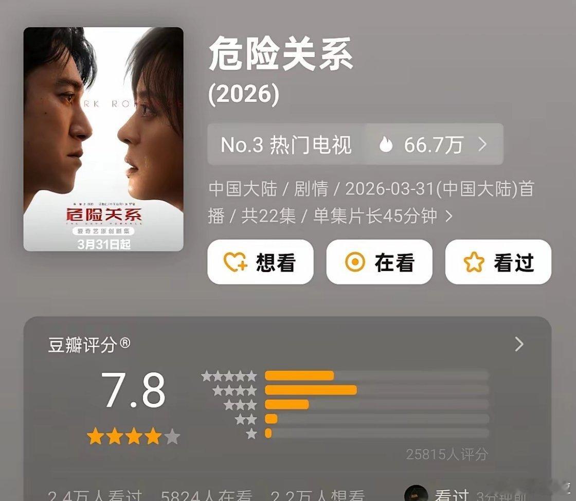 最近,有两部现实题材剧豆瓣开分了,孙俪吴慷仁《危险关系》,口碑7.8分,龚俊任敏《家事法庭》,口碑7.2分。在《月鳞绮纪》和《白日提灯》两部特别能炒作的古偶流量剧围困中,口碑还能突破7分,也是难得。演技方面,孙俪吴慷仁的对手戏肯定是精彩的,那种窒息的情感操控,让观众跟着角色一起经历。龚俊任敏的表演中规中矩,龚俊我是真没看出多大变化,如果忽略类型,我还以为又看到了苏暮雨。单纯说说两部剧缺点吧,也是国产剧通病。《危险关系》里叙事稍显混乱,侦破案件和感情纠葛并线推进,难分主次。其实,侦破案件不应该成为主线,重点就应该放在男女主情感方面,深入解读情感pua,或许会比现在更好点。《家事法庭》不应该给男女主留感情线,我从男女主因误会相遇就已经猜到他俩最后会在一起,果不其然他俩相爱了,这样的套路太俗太狗血,国产剧真的就不能让角色好好干事业吗?