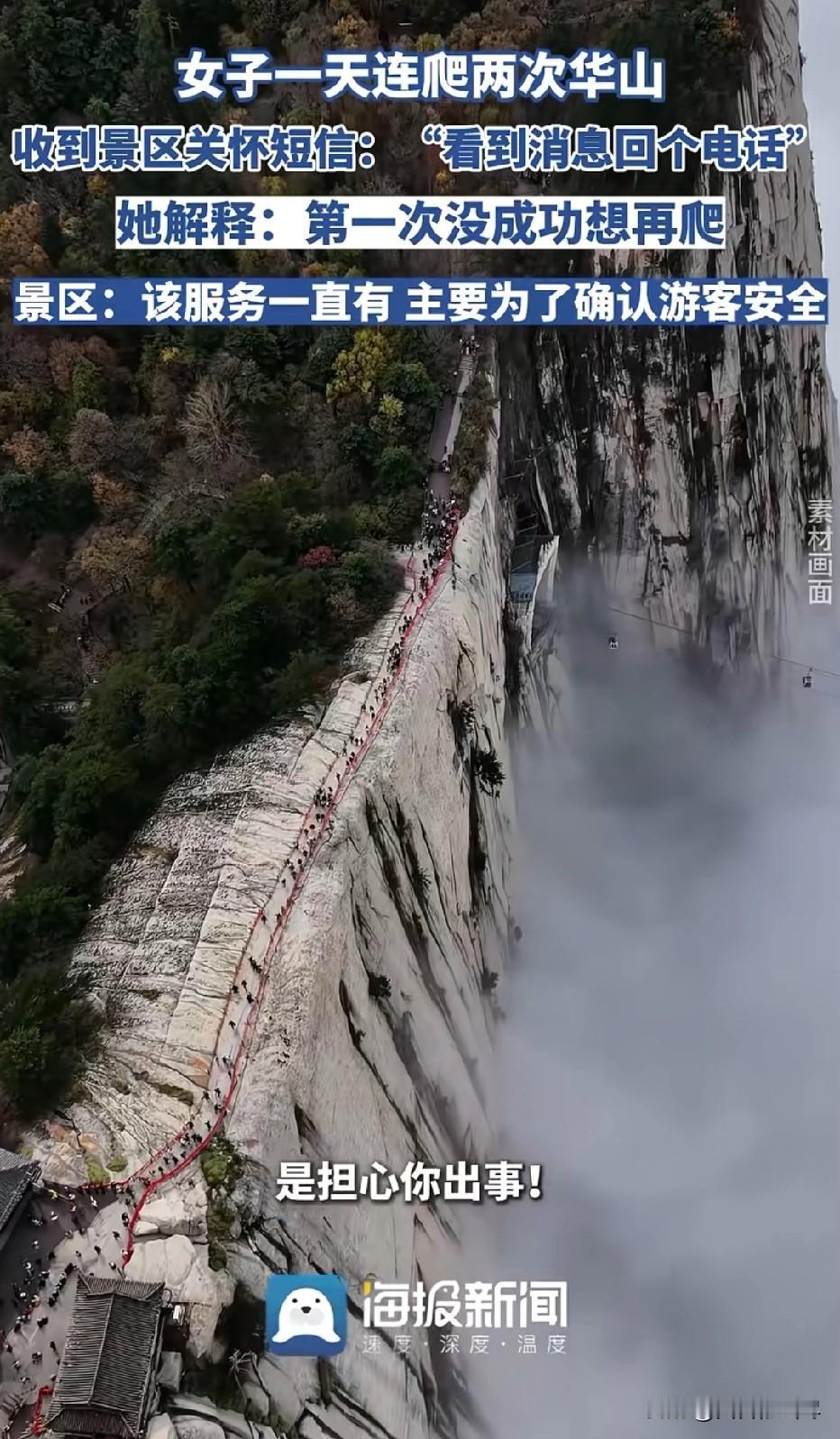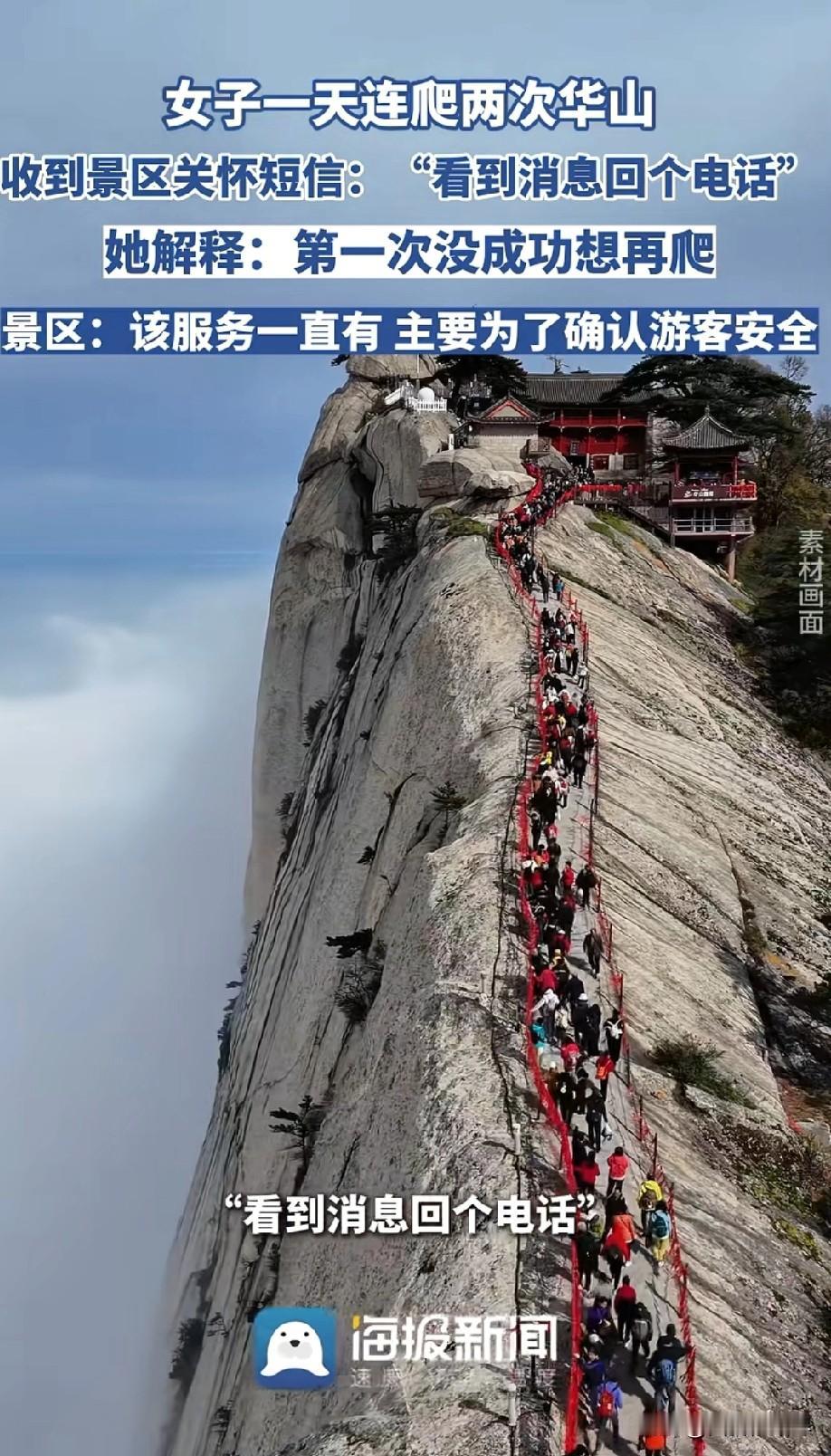太暖心了!近日,游客卢女士在爬华山过程中第一次体力不支选择下山,晚上又买票复爬,没想到收到了景区关怀短信:看到消息回个电话。景区表示该服务一直有,主要为了确认游客安全。