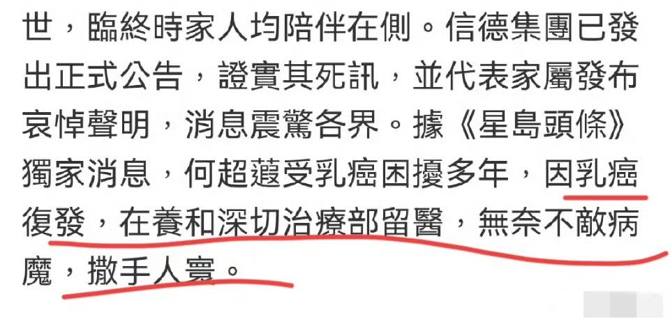 赌王女儿何超蕸(霞)因乳腺癌复发,医治无效在养和医院辞世,终年60岁。她与姐姐何